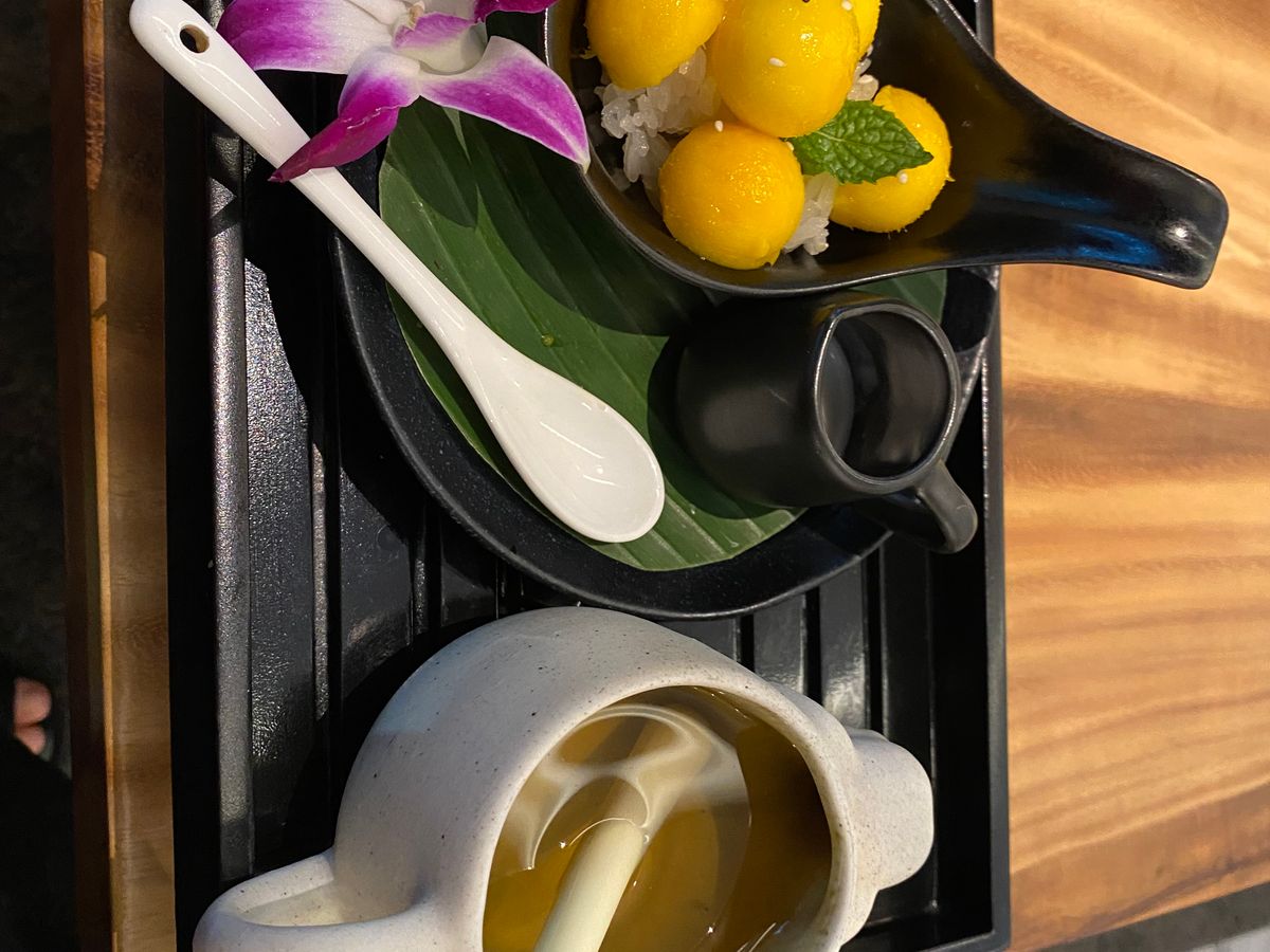 シャワーをして身支度をすると,マンゴーと餅米のココナッツミルクデザートとジンジャーティーを頂きます。