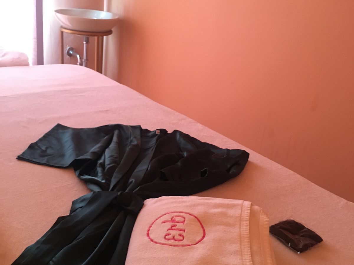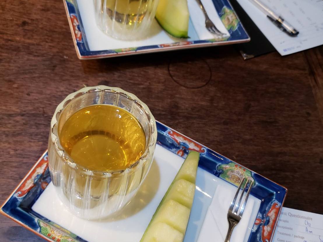 ウェルカムドリンクをいただいた後、フットバスのエリアに移動し、フットバス時にマッサージの強さ(soft, medium, strong)や、重点的に施術してほしい場所、触ってほしくないところなど聞いてくれます。フットマッサージが終わると、部屋に案内され、使い捨て下着とローブに着替え、施術開始です。