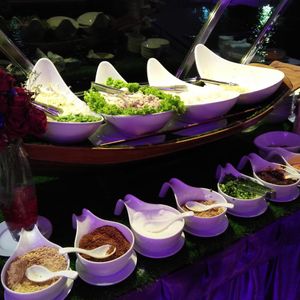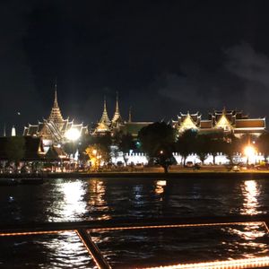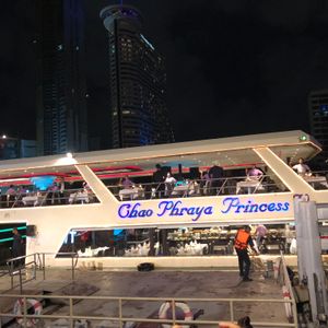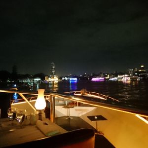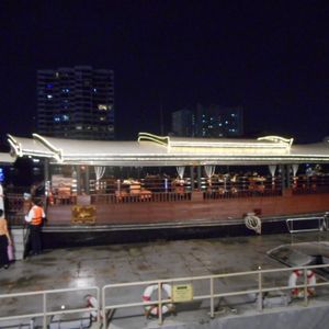 タイ旅行最後の日に記念にと思って友人と申し込みましたが、まず席の上のエアコンからずっと水がぽとぽと落ちてきて困りました。料理は海老ばかりで、サラダはパクチー風味のものばかりで苦手なのでおいしくなかったです。バイキング形式だからたくさん取ったけど、残してしまうものが多かったです。音楽も歌う人とギターの人のふたりで知らな曲が多くてイマイチ。まぁまぁの値段なので、もっとお得な値段で演奏も料理も無しのクルージングだけでよかったかも。寺院等のライトアップは綺麗でした。