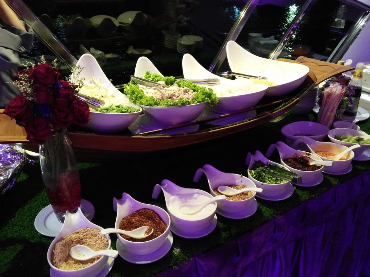 三歳の息子と参加しました。雨が降っていたので室内に移動は仕方がないことだが、タイの民族のショーも遠く離れたところで、こちらに来て一緒に写真を撮るなどのサービスも無かったので、ただのクルーズバイキングだった。寺が近づいたら外に出て写真を撮るサービスがあったようだが、特にお知らせもなく…撮れなかった。船を降りる橋の手前で、その写真が販売されていました。