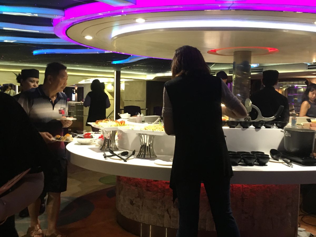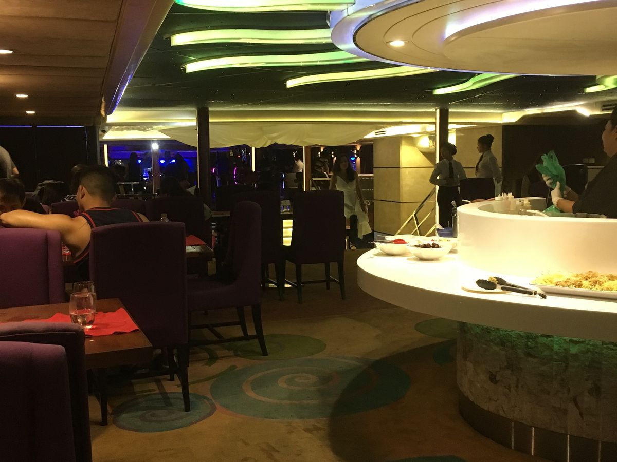 カウントダウンだったからか 現地集合で自分達でチェックインして自分達で船に乗り込み通された場所が一番下の階。ご飯食べたら上に上がっていいものなのか全く分からず11時45分位までは一番下の階で従業員さんが沢山いるところで冷房が効きすぎる部屋にいた。カウントダウンは楽しかったけど また夜中に自力でホテルに帰るのが辛かった