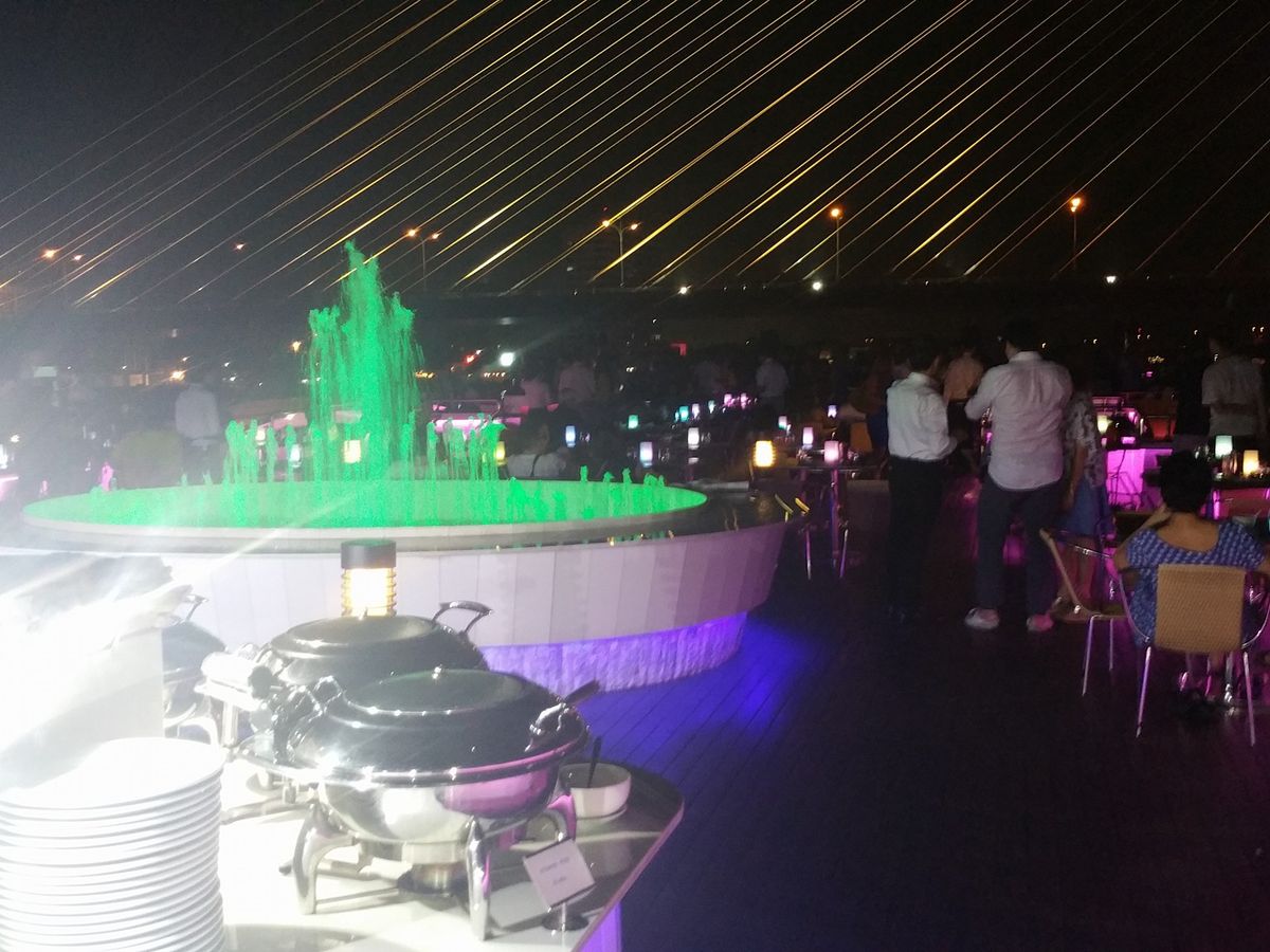 生バンドを聞きながらの最高の夜景でクルージングは、クルージングは申し分ありませんでした。バンコクでいろんなクルージングに乗りましたが、やっぱりオープンデッキがあり生演奏が有るのが最高です。