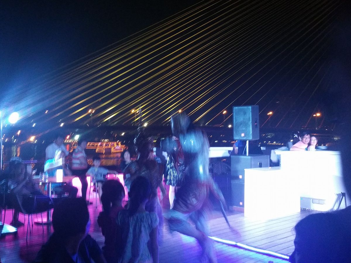 船内の屋上ではロックなライブが開催されていて、タイの市内をまわりながら聞く音楽はとっても素敵で、夜景もきれいでした。