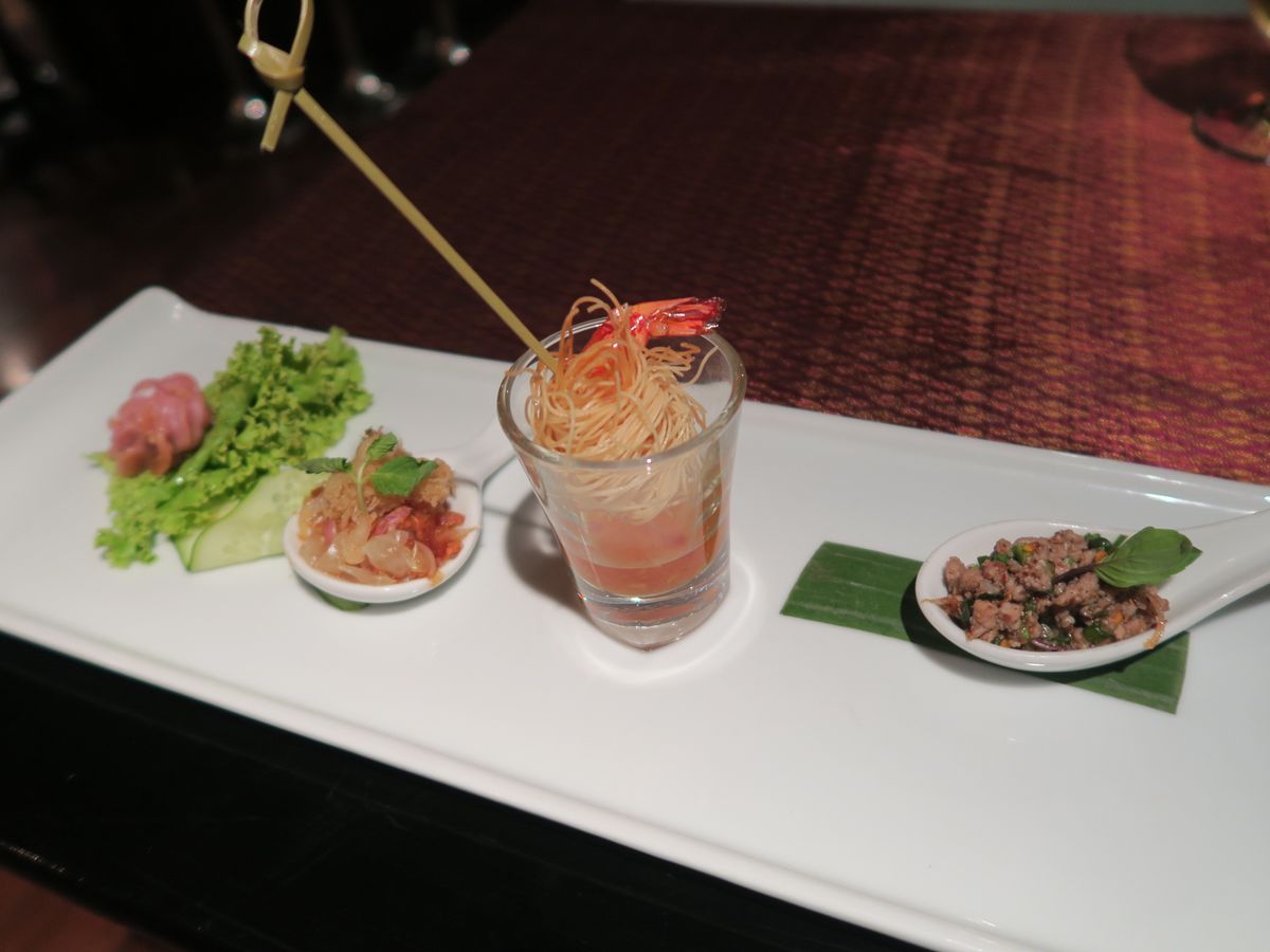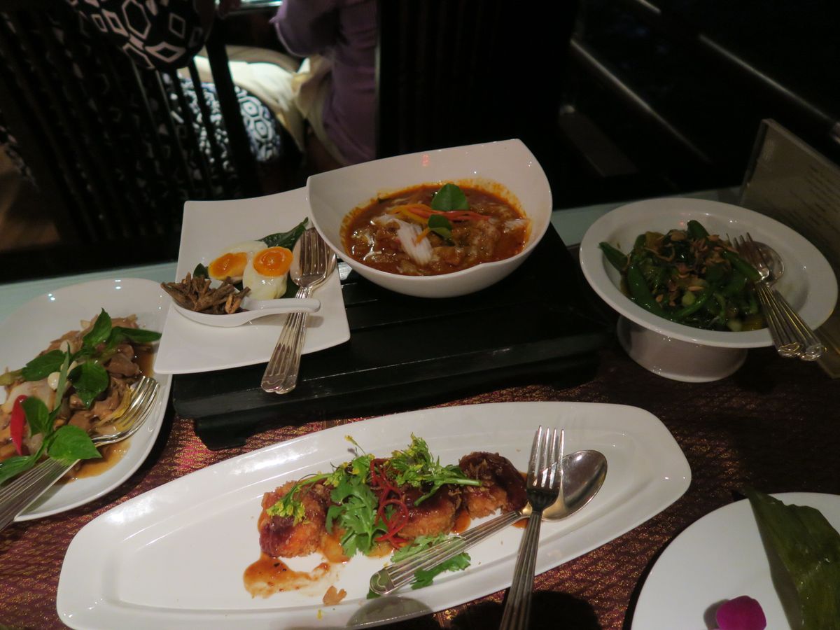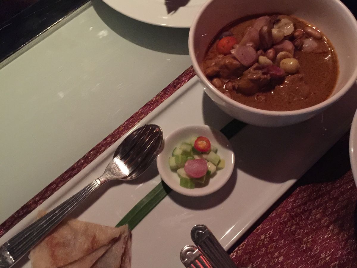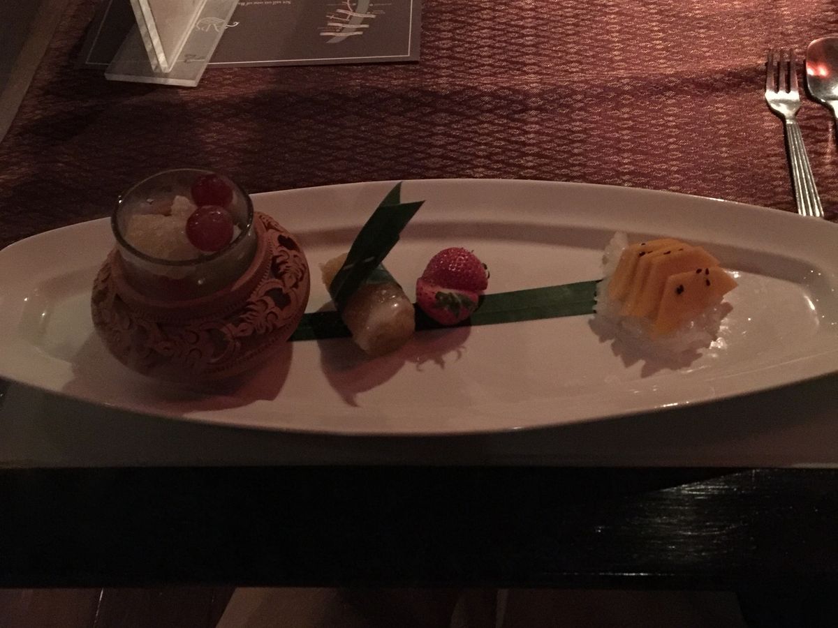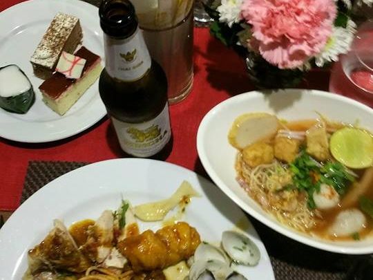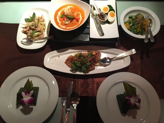 料理は、実はあまり期待していなかったのですけど、充分満足できるタイ料理でした。前菜、スープに続いて、タイ式にメインがガッツリ出てくるのですが、前菜が出た後に記念撮影タイムがあり、お料理はゆっくりサーブされるので、メインをいただく前に何となくお腹いっぱいになってしまい少し残念でした。ホタテとパイナップルのレッドカレーがとても美味しかったです。