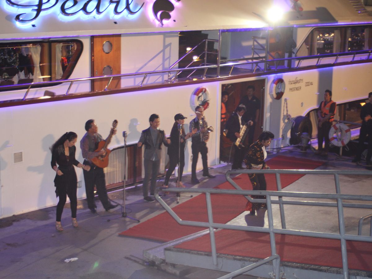 私は船が苦手なのですが、揺れも気にならず、快適にディナークルーズを楽しめました。ネットで申し込みした後に、問い合せでデッキ席のリクエストを入れていたので、希望どおりデッキ席に座る事ができました。景色が良くて、バンドや舞踊も近くで見れて、食事もトムヤムクンや白身魚がおいしかったです。