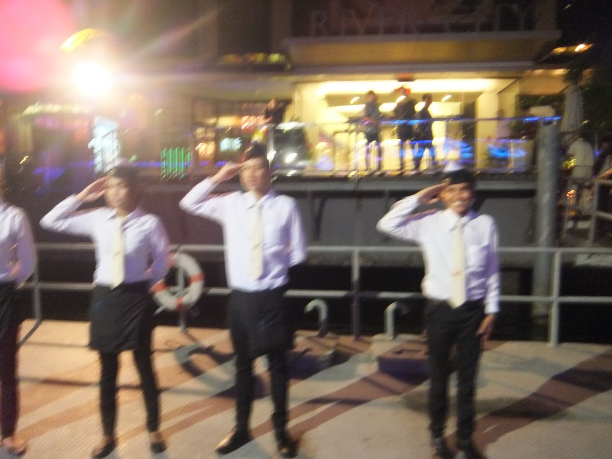両岸にライトアップされた金色の寺院を眺めながらのディナーを楽しみました。食事は普通でした。出発直後は、ビュッフェ式の食事を取るために、行列ができましたが、量が不足することはありませんでした。ガイドさんがたくさん写真を撮ってくれたので良かったです。デッキでは生バンドでジルバなどのダンスを楽しんでいました。