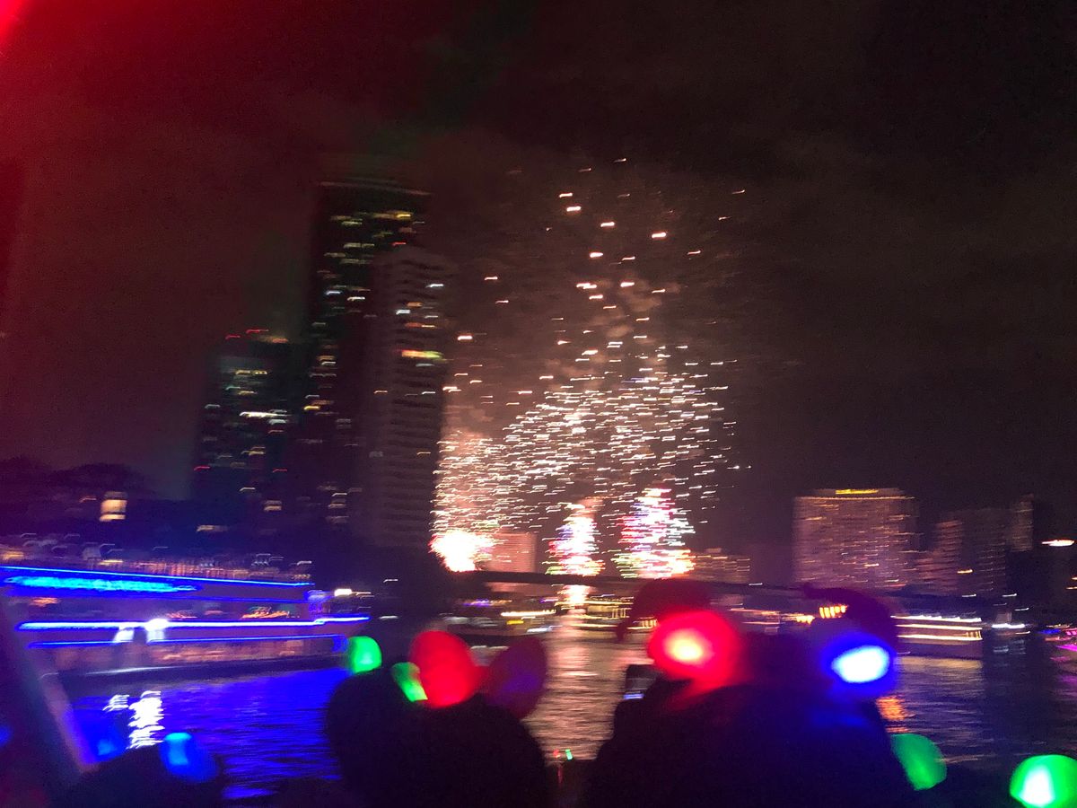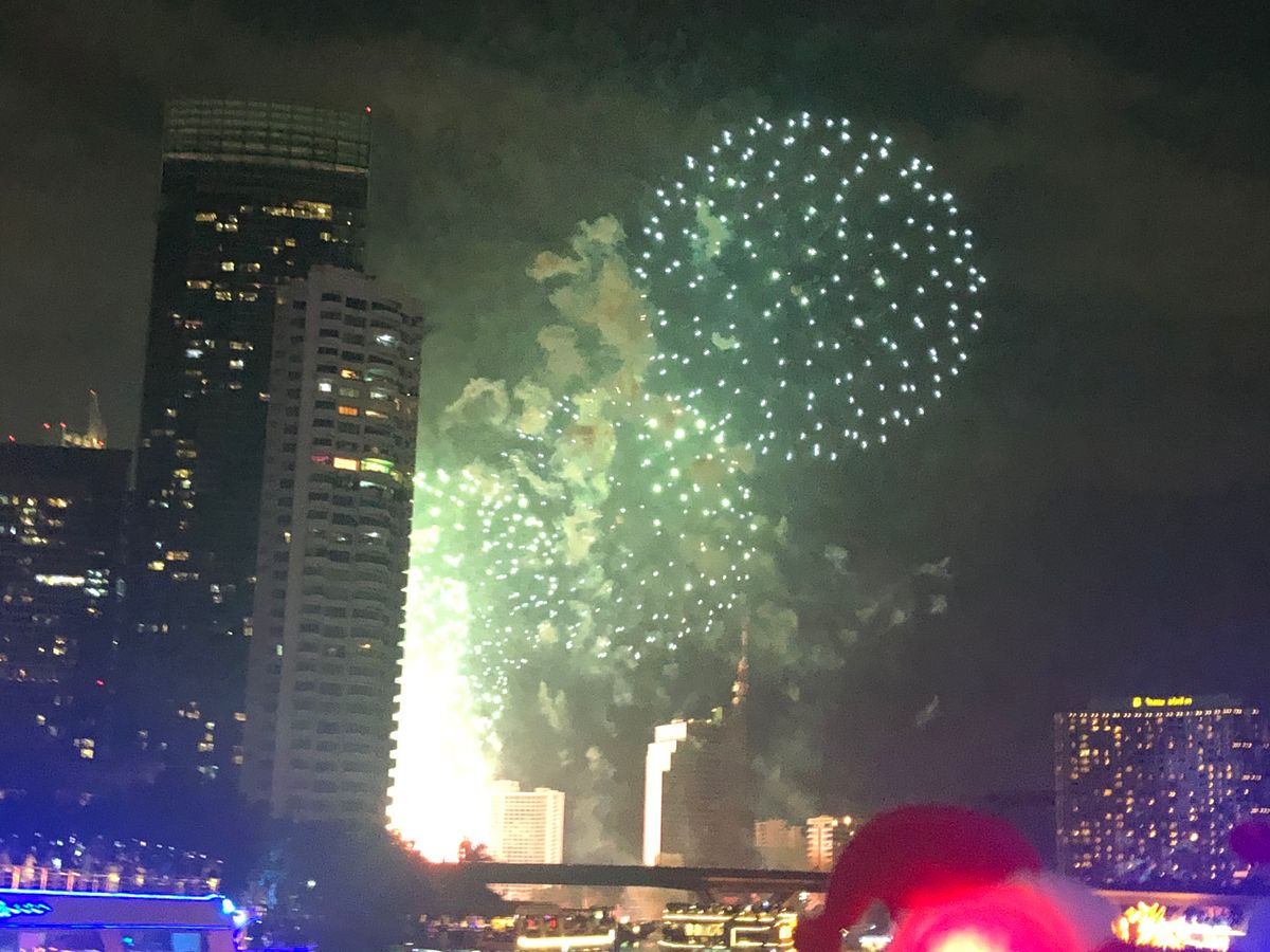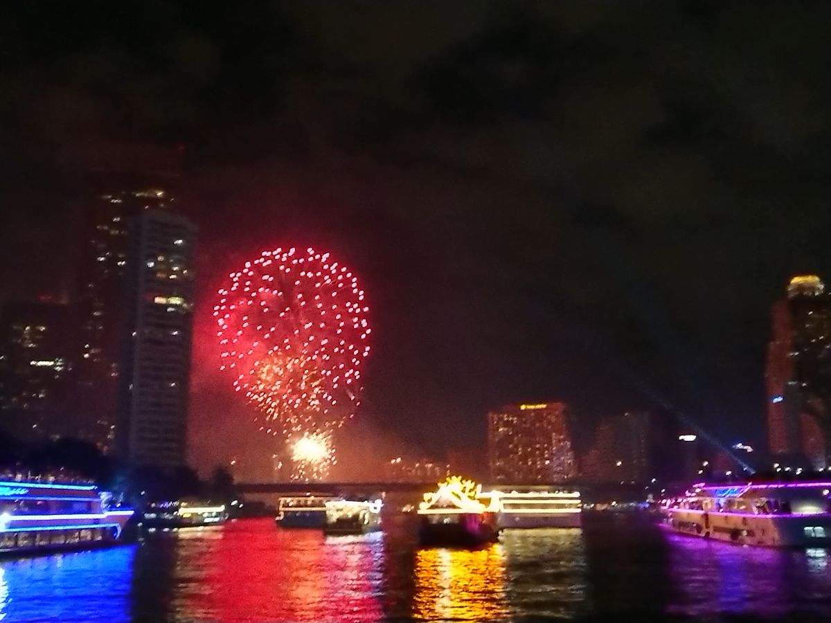 隅田川やお台場沖の花火鑑賞ほどではないけれど、チャオプラヤ川でハッピーニューイヤーの花火を見られるというプランが面白い。食事の味もサービスも充実していて良かった。唯一の欠点は集合や乗船の案内が不足していること。将棋倒しになるのではないかというくらいので人混みで、予定時間を過ぎてもどうしていいかわからずひたすら待っているいらだちの状況は周りの人も皆同じでした。