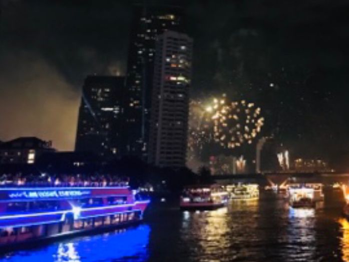 初めてのカウントダウンクルーズ。当日バンコクに到着し、ホテルの部屋にスーツケースを置くやいなや現地に集合しました。日本でいうところの大晦日で混雑していましたが煌びやかな船を見てテンションが上がり乗船してからも、めいっぱい楽しめました。ドリンクやお料理も十分にありました。アンダーでエアコンがあり嬉しかったです。じっとしていると寒くなるのでやはり上着は必要で、持って行って正解でした。花火も2カ所から上がり得した気分です。あまりに感動し二日後にも同じ場所に出向きました。楽しい時間をありがとうございました。