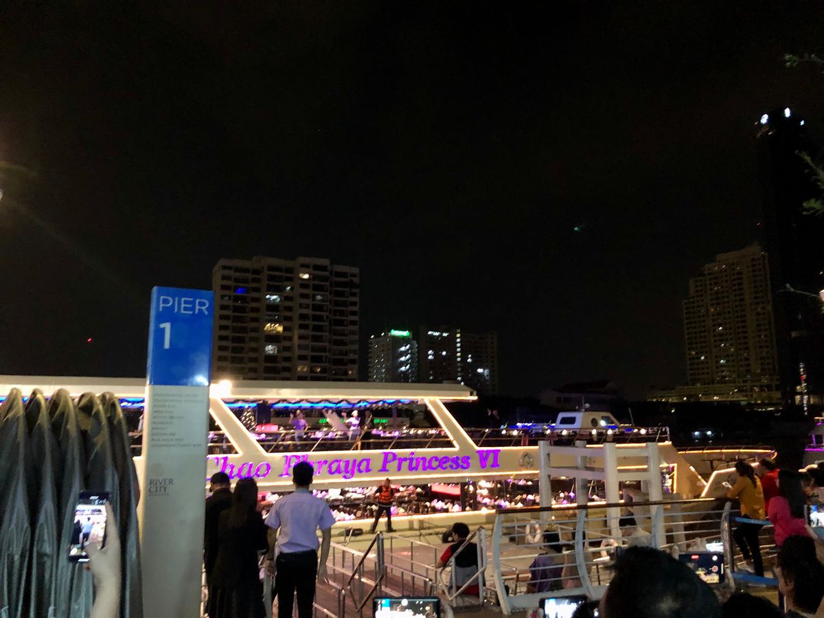 息子と2人での参加でしたが、かなり喜んでくれました!なかなか子供の口に合う食事が難しい中とても喜んでくれたからです。そして子供を連れての3大寺院巡りは過酷だなと思い、『そうだ3大寺院が一気に外観ライトアップで見れるならそっちの方がいいのでは?』という目論見は大正解でした!船着場だけでもいろんなショップがあり自由時間があるのでショッピングも楽しめます。まず記念撮影してもらい乗船!橋桁をくくる時はダイナミックでテンション上がります!として派手目なライティングがいかにもタイらしく。船内で舞踊やバンド演奏も披露してくれます。気になる食事ですが、まず腹痛を心配している方!ここのビュッフェは衛生的でお腹の弱い僕でも美味しくてガツガツ食べましたが全く大丈夫でした。最後はホテルまでしっかりと送迎してくださせいます。