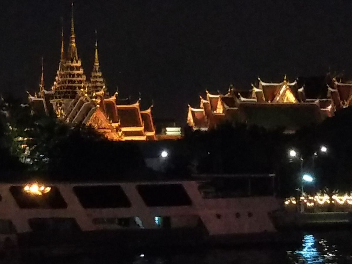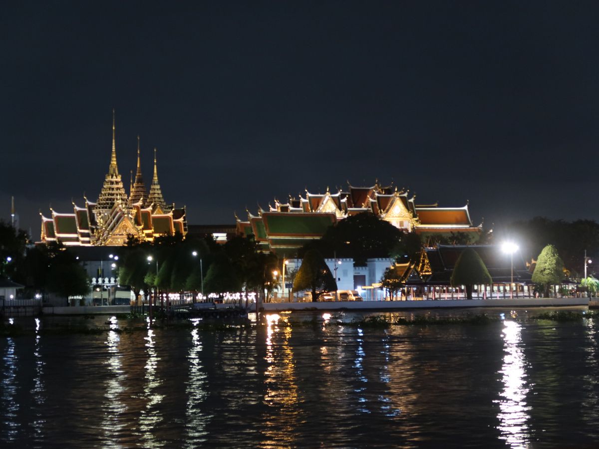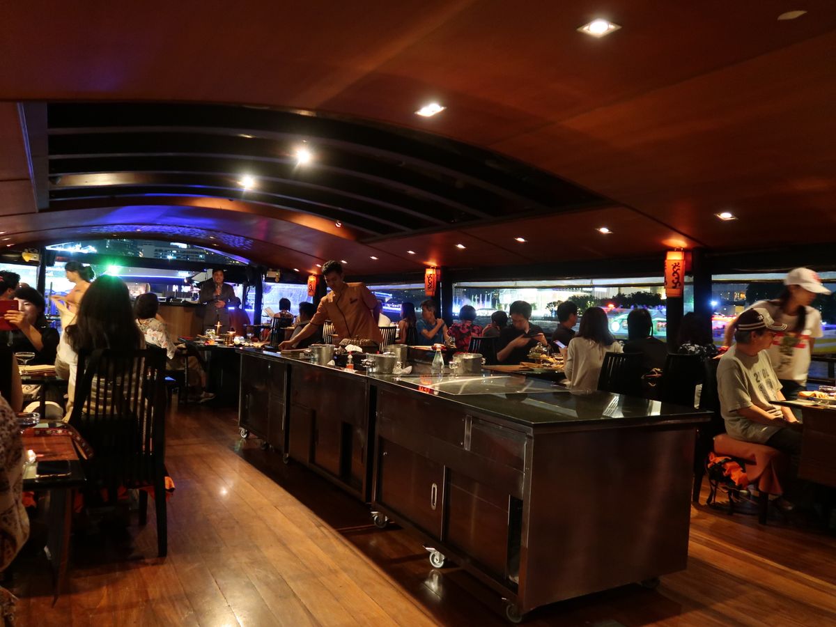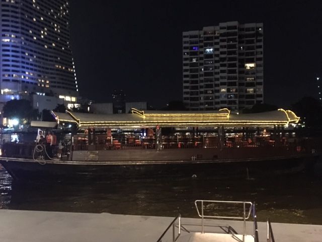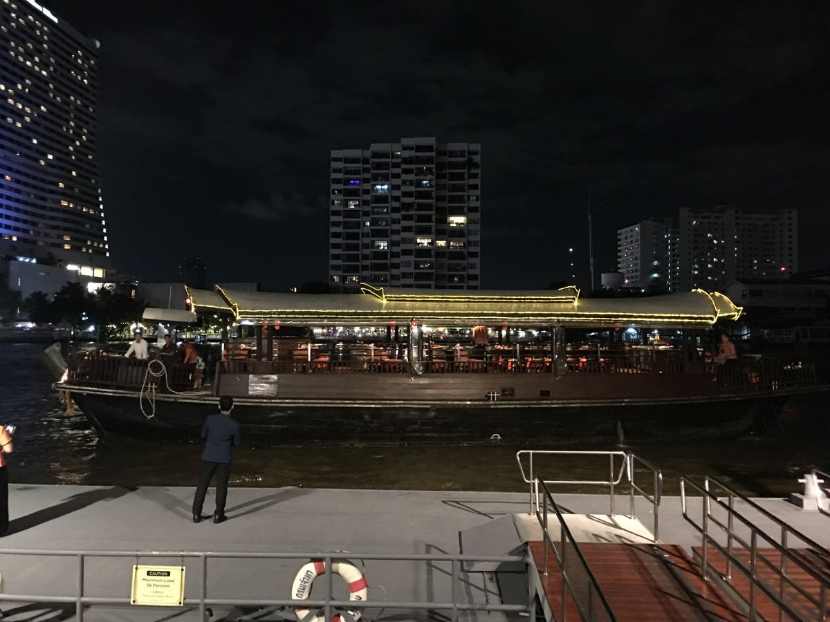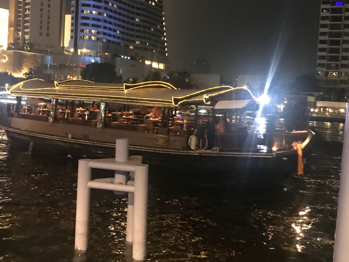 出船30分前に一番前に陣取り、船上の生演奏を聴きながら予定通りに乗船、3階の船首中央のアウトドア席を取って頂き、ビールと美味しい料理を食べながら、約2時間半の優雅で両岸にライトアップされた雄大な寺院、船内では生バンドでの歌とタイ舞踊を観ながらの優雅なディナークルーズを楽しまさせて頂きました、途中で大粒なスコールに見舞われましたが、直ぐにキャビン内に新たに席を設けて案内され、サービスもとても満足が出来ました。