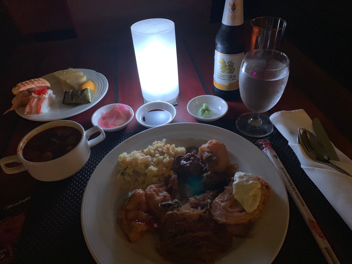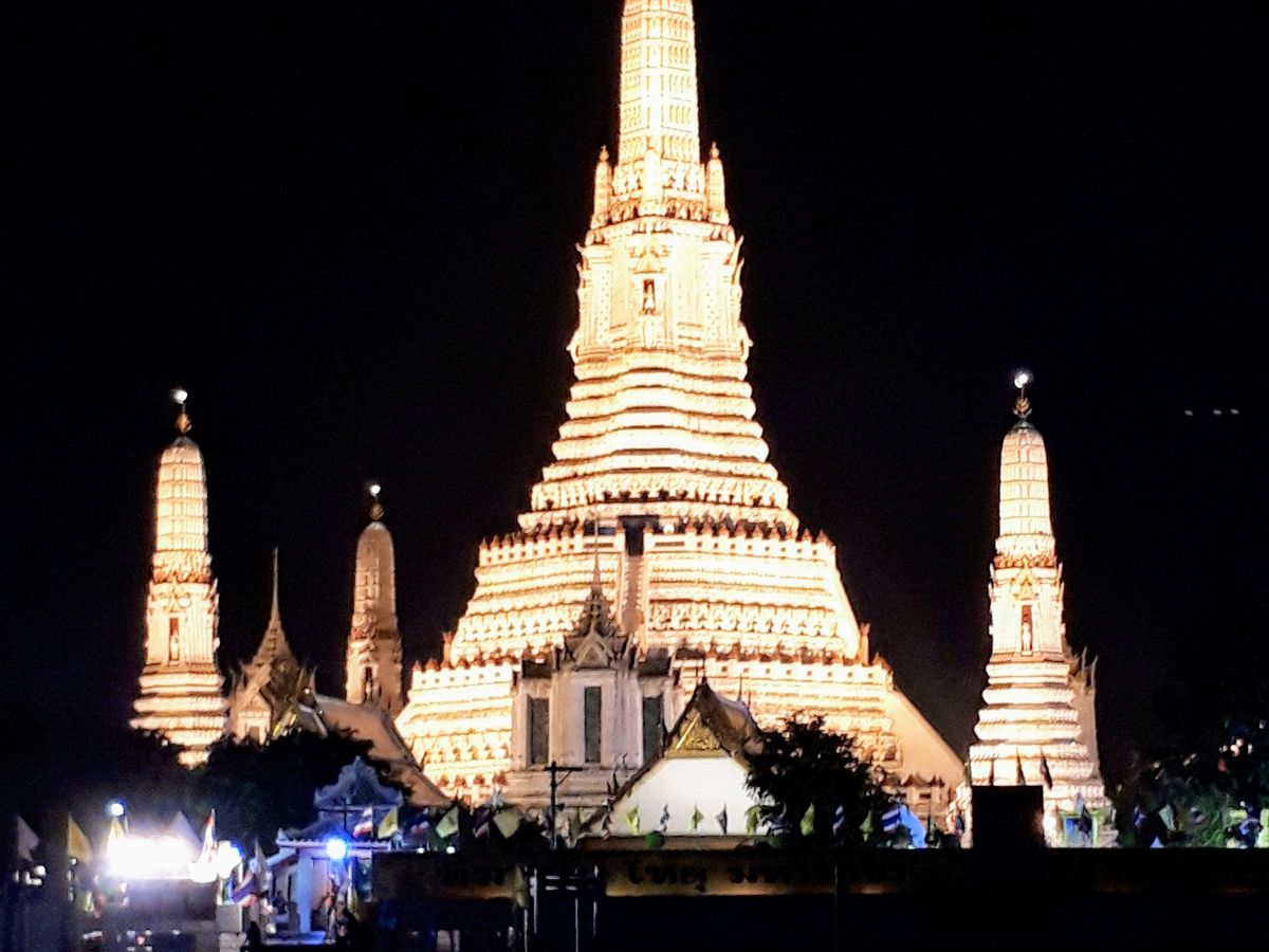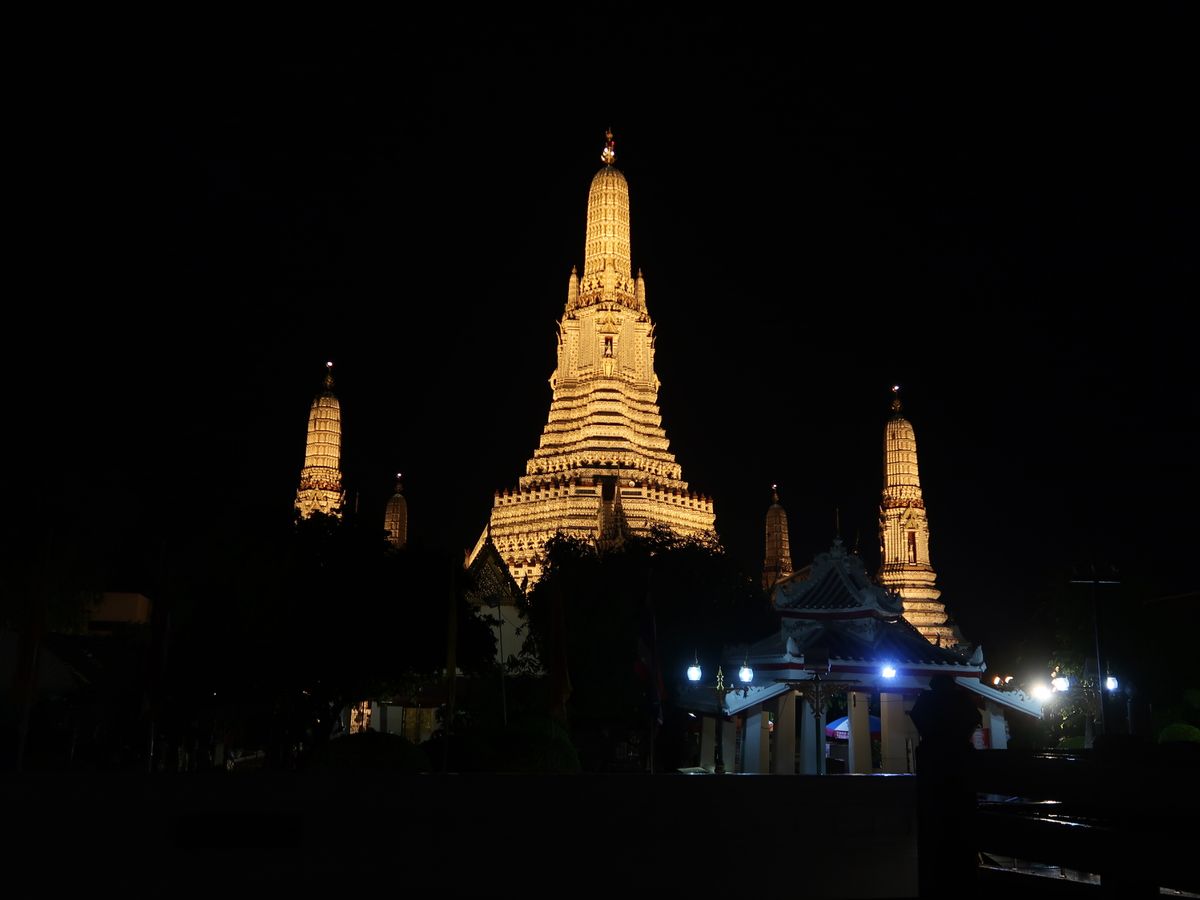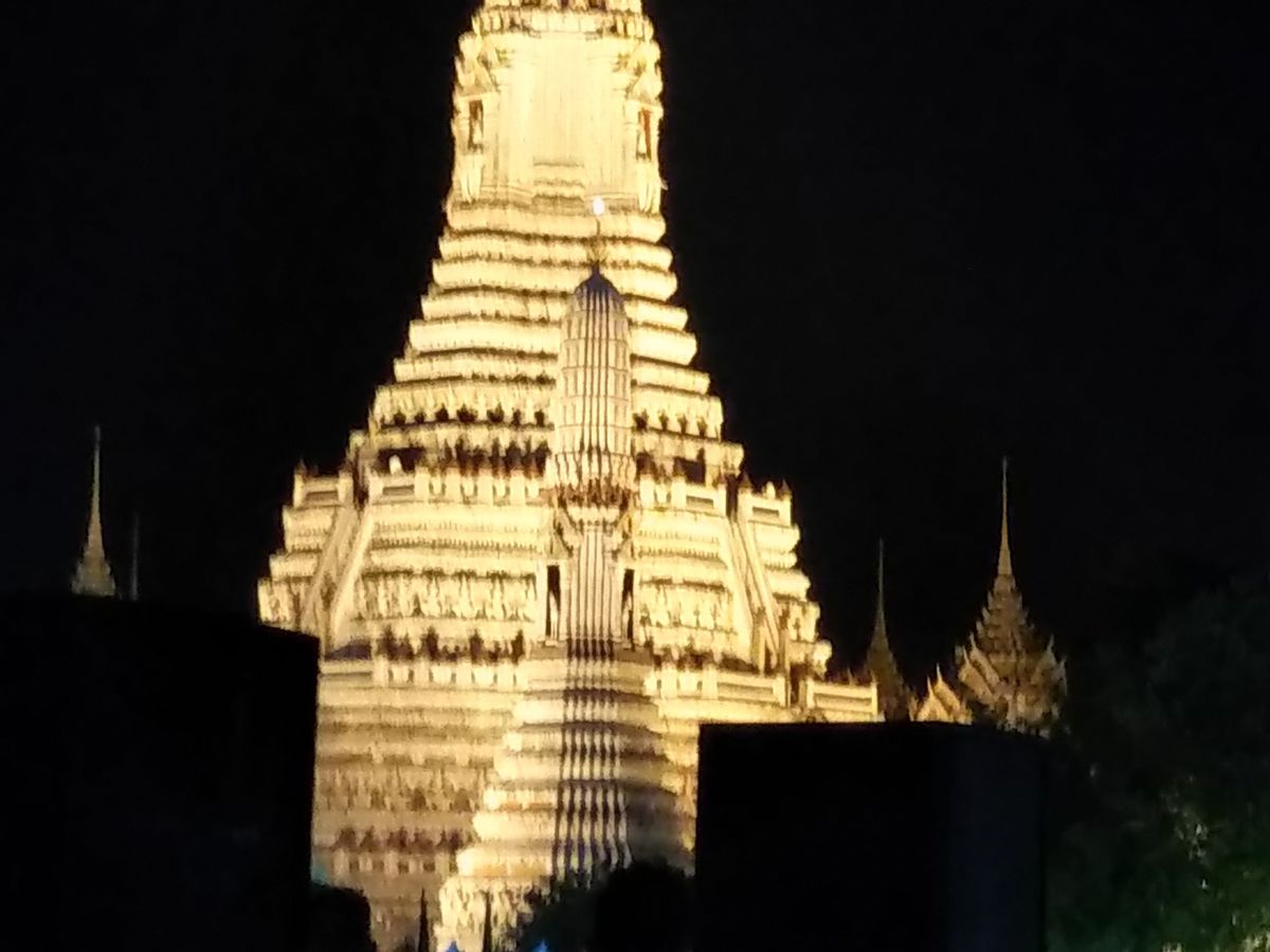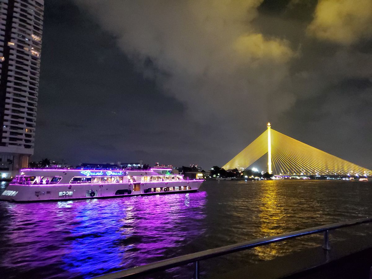 出船30分前に一番前に陣取り、船上の生演奏を聴きながら予定通りに乗船、3階の船首中央のアウトドア席を取って頂き、ビールと美味しい料理を食べながら、約2時間半の優雅で両岸にライトアップされた雄大な寺院、船内では生バンドでの歌とタイ舞踊を観ながらの優雅なディナークルーズを楽しまさせて頂きました、途中で大粒なスコールに見舞われましたが、直ぐにキャビン内に新たに席を設けて案内され、サービスもとても満足が出来ました。