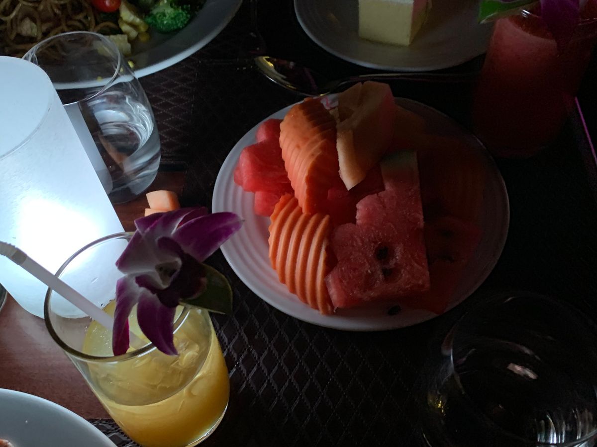 食事は普通に美味しいです。ただ、ビュッフェなので、コース並みの期待はしないように。あと果物も早めに取っておかないと、もうない(◞‸◟)って事になります。早めにしっかり食べて、後半はゆっくり楽しんで下さい。