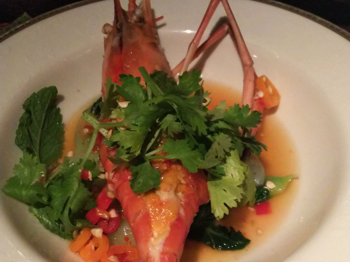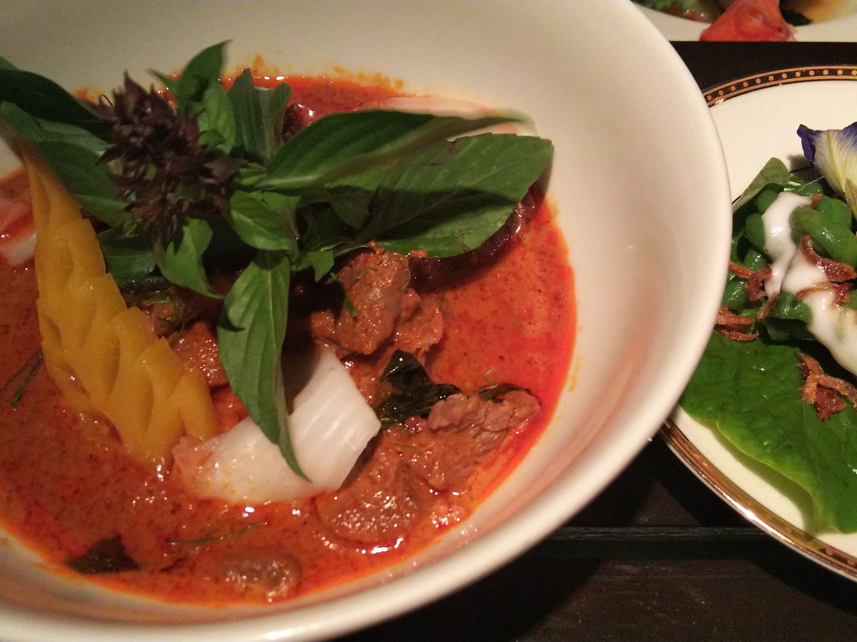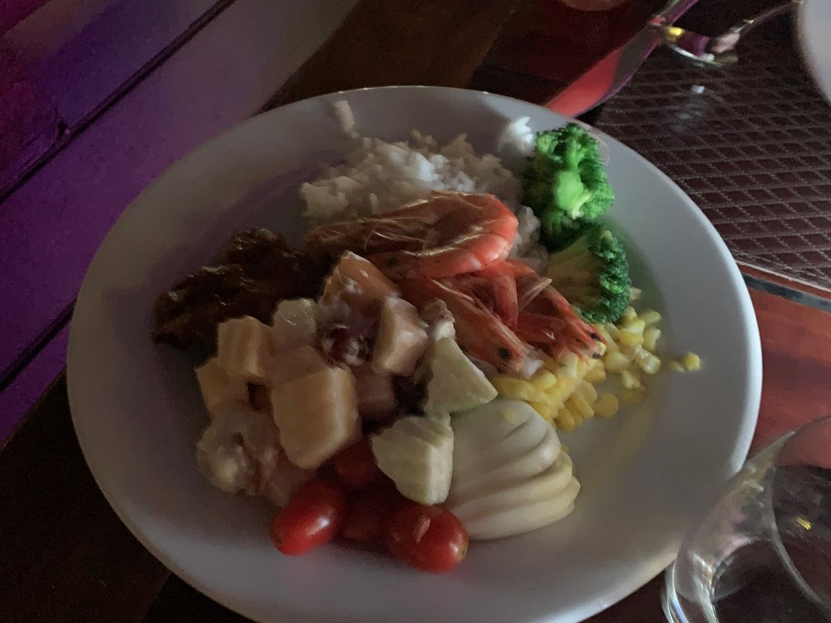 メイン→ココナツミルクを使った牛カレー、キノコのオイスター炒め、オニテナガエビの焼き物、魚を揚げたあんかけ
