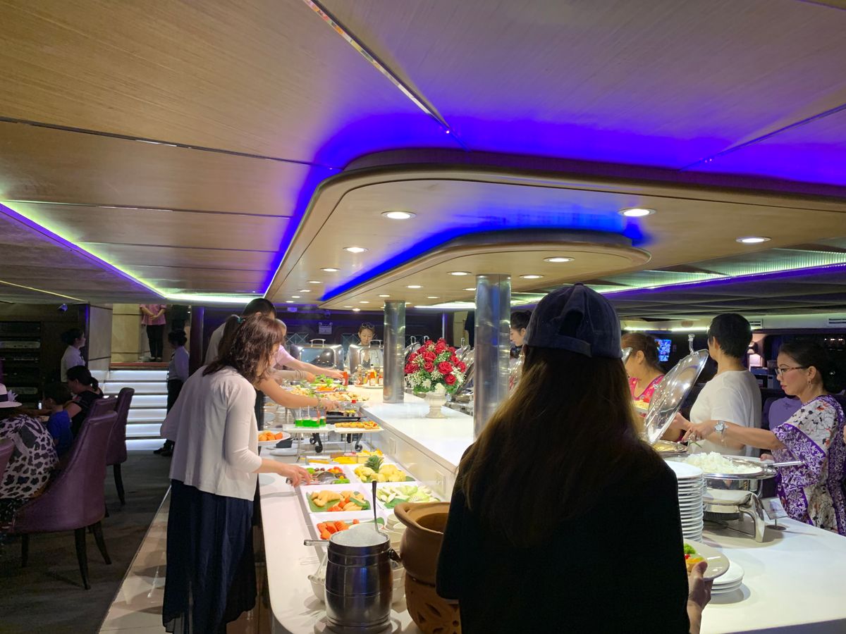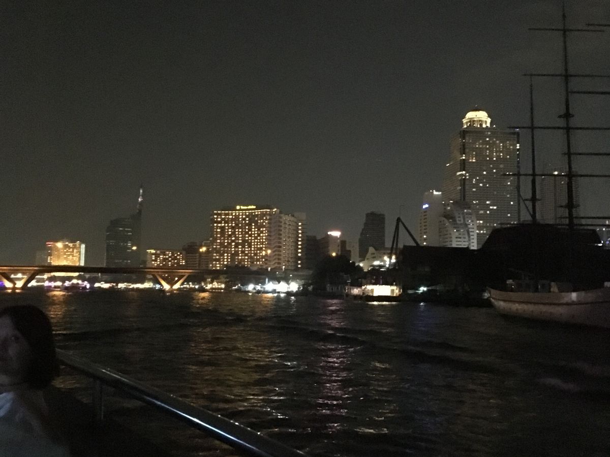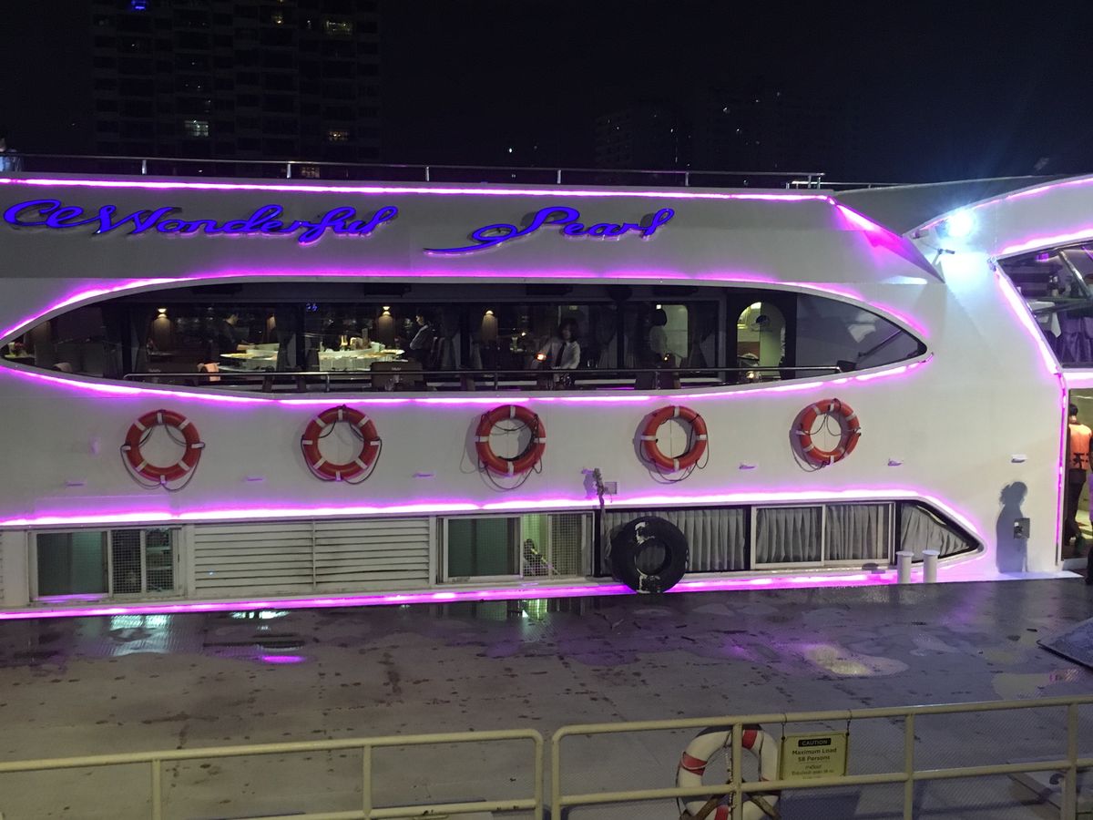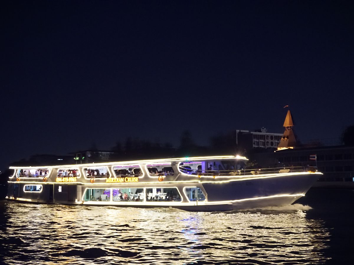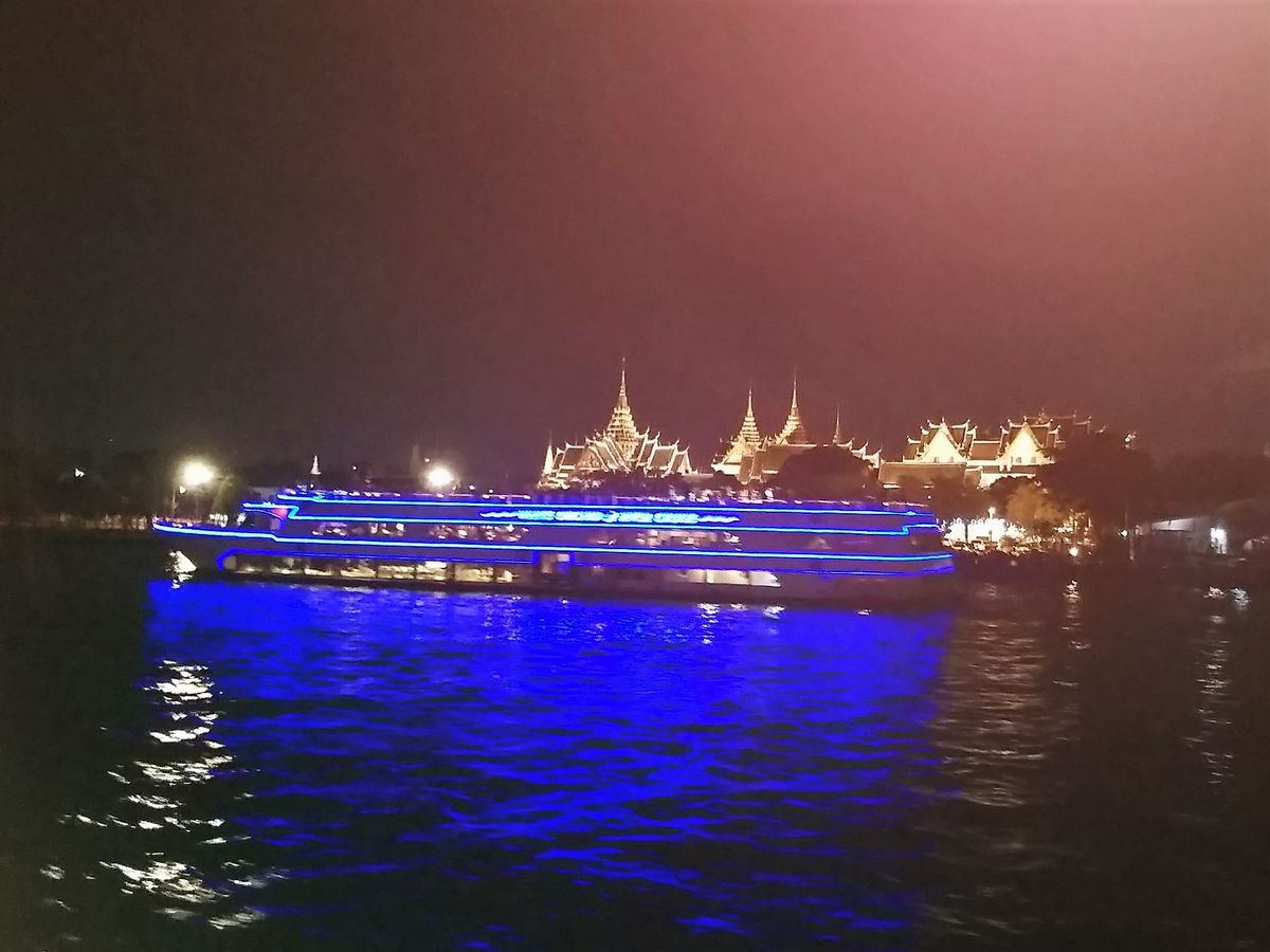 時間になり乗船しました。すぐに出航するかと思いきや約20~30分は停泊した状態でした。その時間(揺れていない時間)を含め食事が準備されてましたのでブッフェ台まで料理を取りに行ったり、ドリンクをオーダーし、飲んでいたりしておりました。ちなみに席は外を予約(座席予約は外が抜群に良いです)してましたので、最初から外での飲食です。出航し、飲食をしながらのクルーズで、ライトアップされたワットや、リバーサイドのホテル、シッピングモールの夜景など大変美しく、バブリーな感じに浸ってました。ガイドさんも乗船していたようで、写真なども取って頂き、親切でとても気の利いた方で安心しました。下船後も、ホテルへ戻る道中、コンビニへ寄ってもらったりと、無理を聞いて頂き感謝してます。