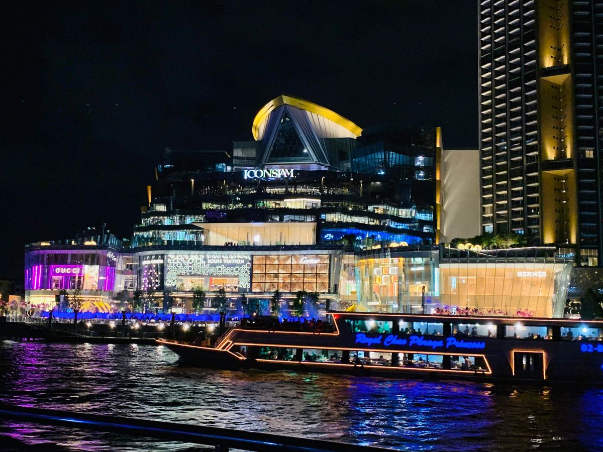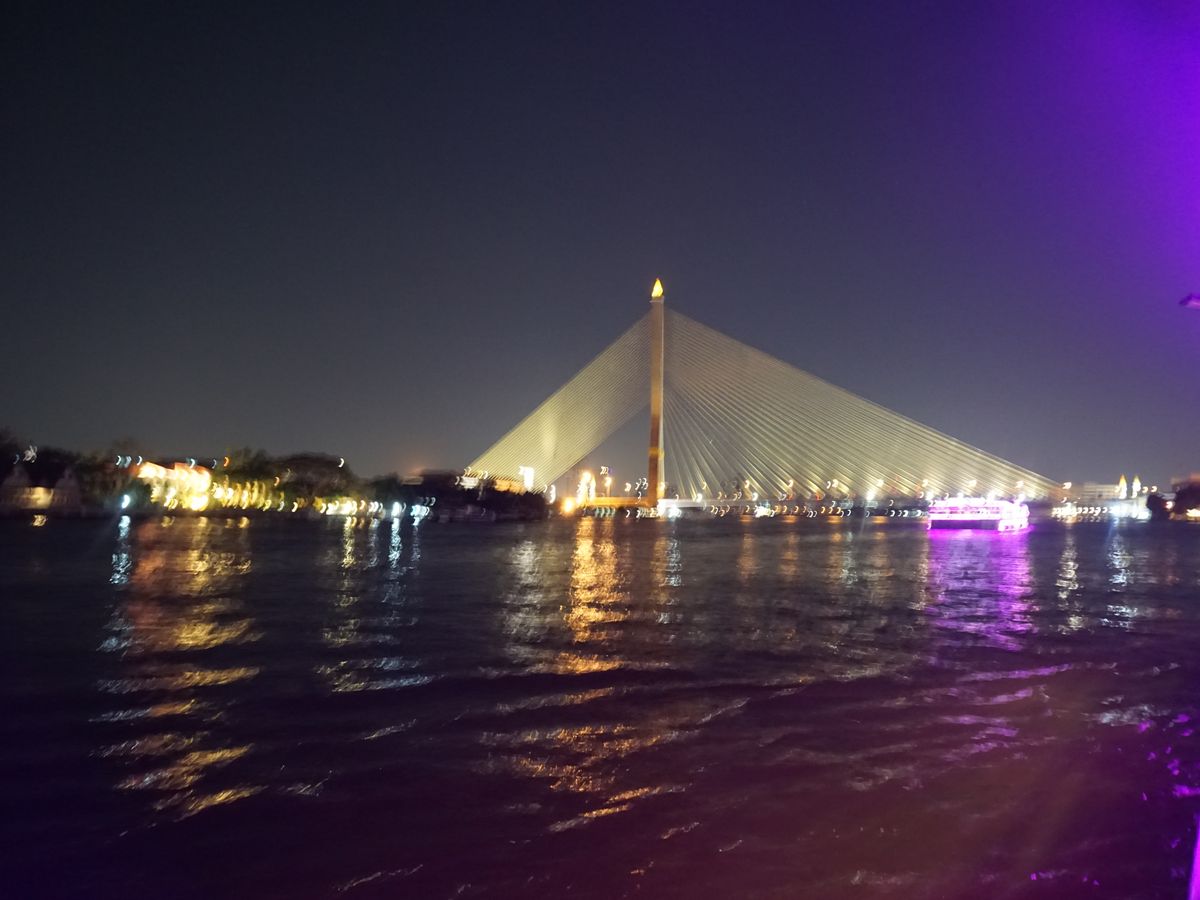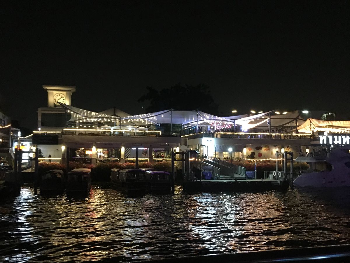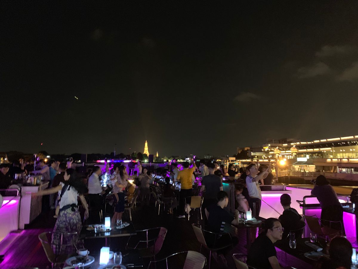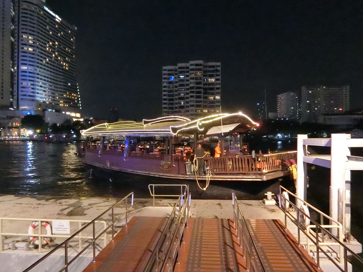 時間になり乗船しました。すぐに出航するかと思いきや約20~30分は停泊した状態でした。その時間(揺れていない時間)を含め食事が準備されてましたのでブッフェ台まで料理を取りに行ったり、ドリンクをオーダーし、飲んでいたりしておりました。ちなみに席は外を予約(座席予約は外が抜群に良いです)してましたので、最初から外での飲食です。出航し、飲食をしながらのクルーズで、ライトアップされたワットや、リバーサイドのホテル、シッピングモールの夜景など大変美しく、バブリーな感じに浸ってました。ガイドさんも乗船していたようで、写真なども取って頂き、親切でとても気の利いた方で安心しました。下船後も、ホテルへ戻る道中、コンビニへ寄ってもらったりと、無理を聞いて頂き感謝してます。