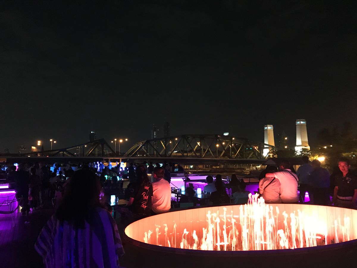 3Fのデッキ(写真)にも足をのばしてみて下さい。噴水がライトアップで綺麗で、橋をくぐる時は近いので、手をあげたりして盛り上がってました!