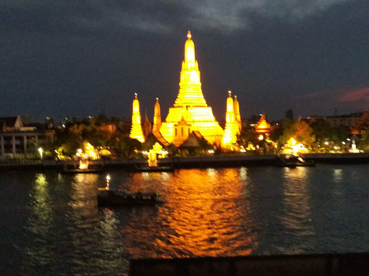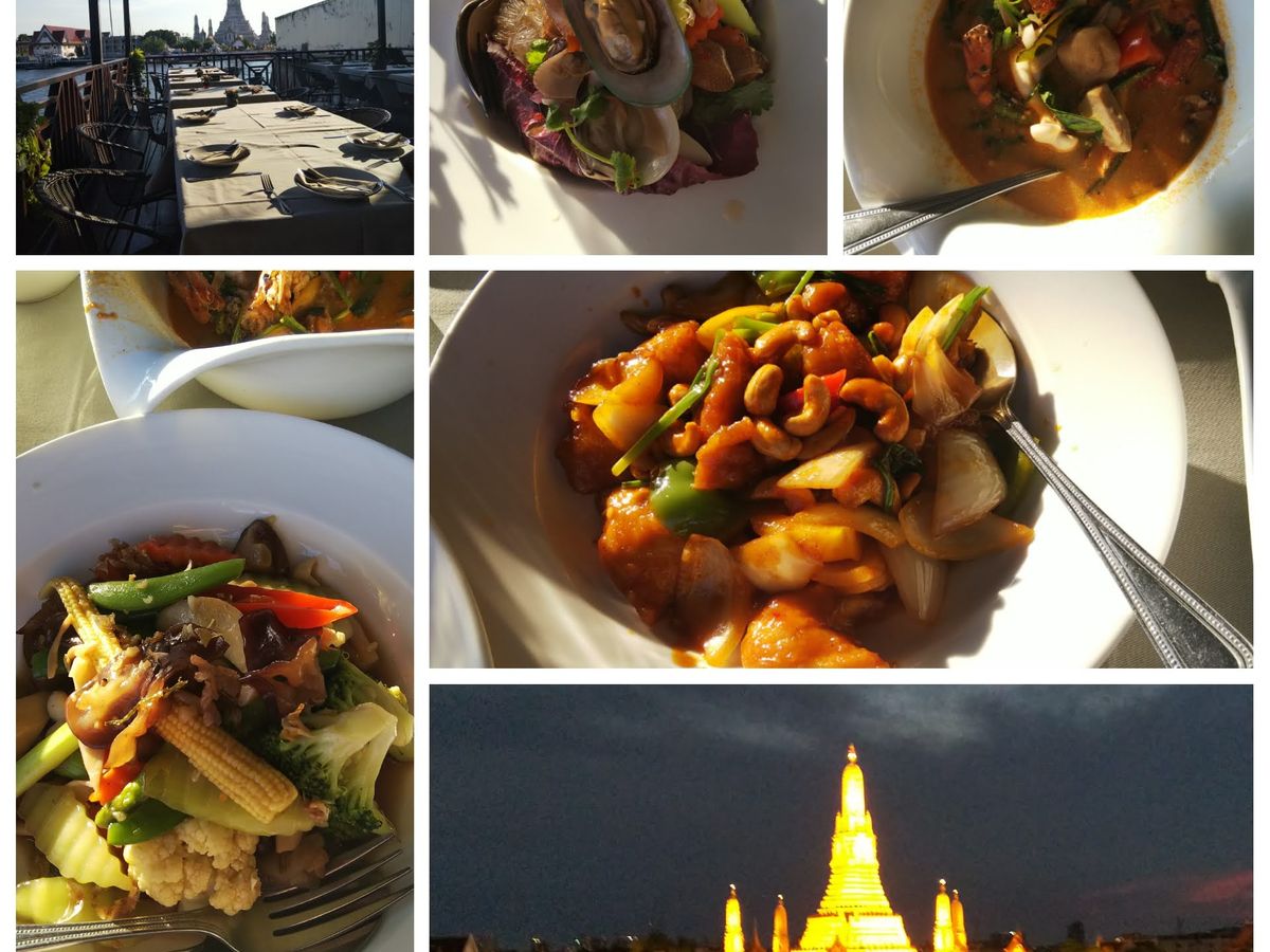 ただし、ディナーのメニューが今ひとつ口に合わなかった。ほぼ同じタイミングで料理が全部出てきたので私も妻も処理し切れず、川が近いせいか、虫が料理に寄ってくるのです。何度も追い払うのに疲れしまい、地元ではおそらく気にはならないレベルかもしれませんが、虫が何度もついた料理は食べる気が失せ、残念なこととなりました。レストランからは夜の美しいワットアルンが眺められます。