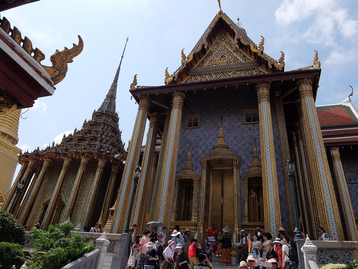 はじめに、王宮、ワットプラケオ別名エメラルド寺院を見学。とにかく混雑!王宮に入るのにパスポートまたはパスポートの写しが必要です。私達はパスポート現物を盗まれないように気をつけて持って行きました。コピーの人で現住所など聞かれている人もいたので、他の国の方々と間違えられたのかもしれないです。入口の係の人にもよるかもしれまでんが、ちょっと緊張の一瞬です。