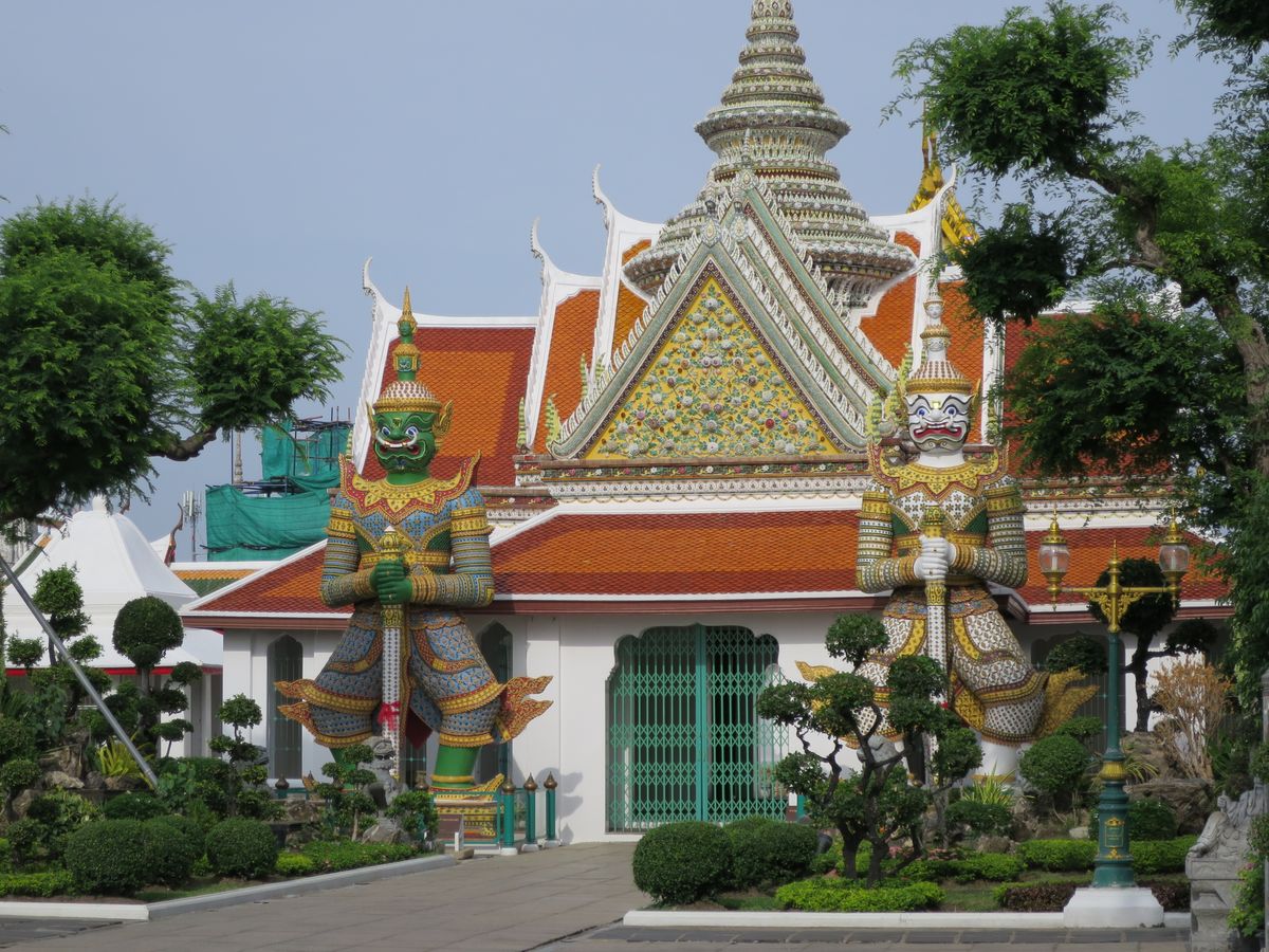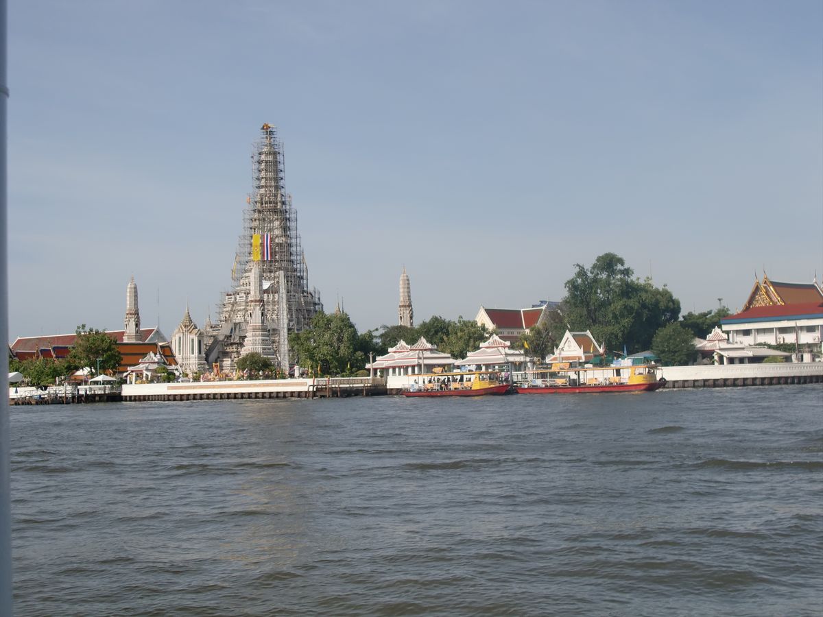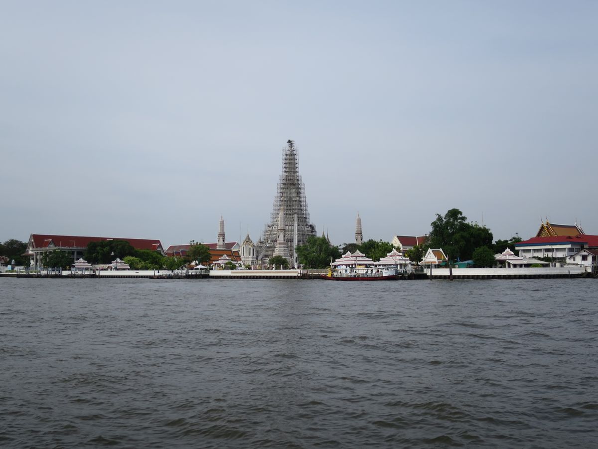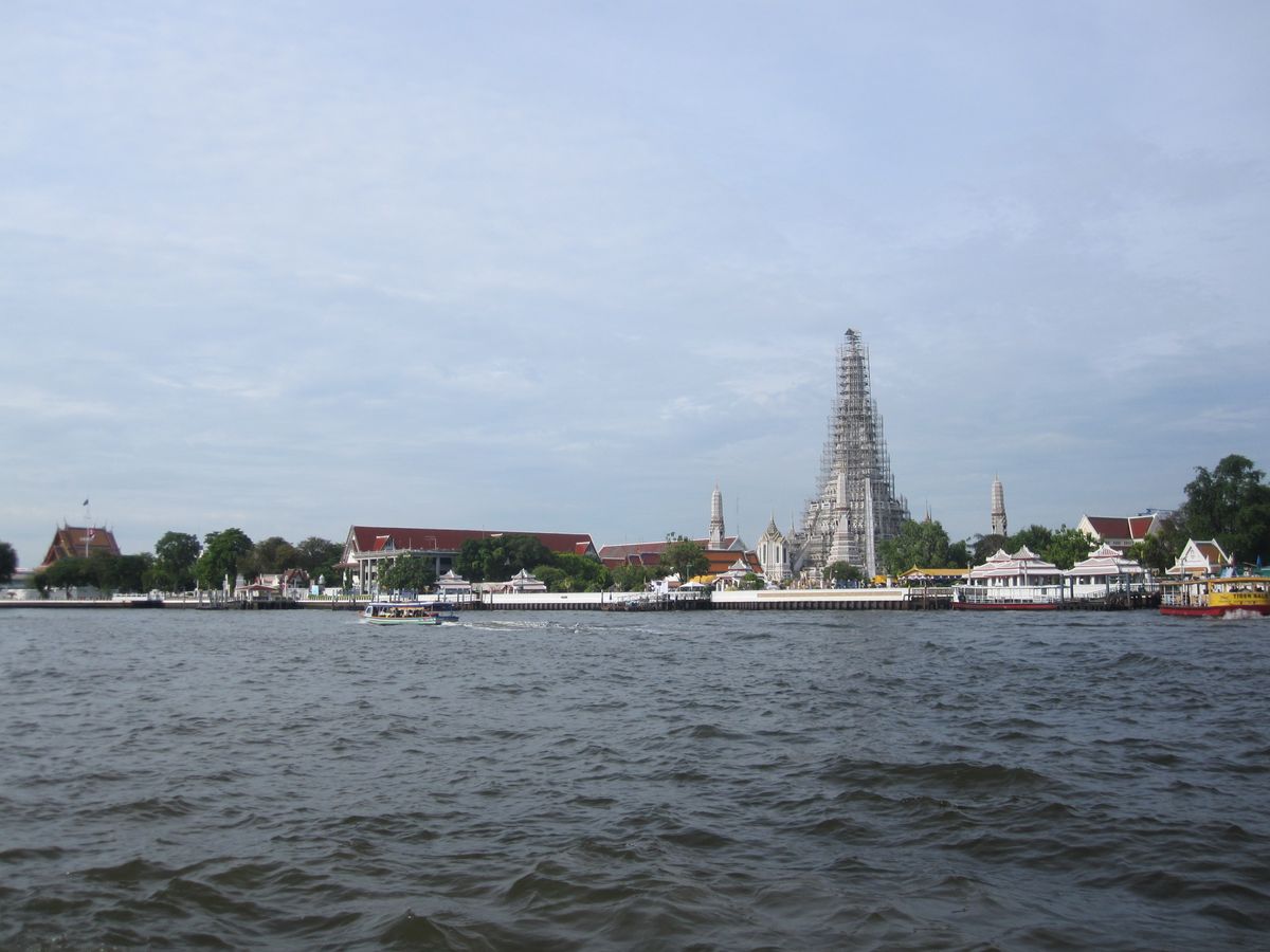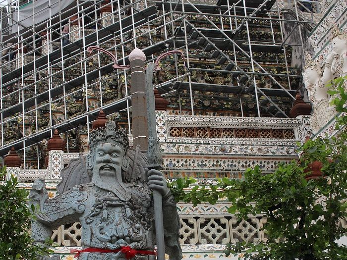 ワットアルン(暁の寺)は、チャオプラヤー川をはさんだ対岸にあり、水上バスで向かいますが、一層、旅情がそそられます。今は一部修復工事中ですが、なんのその見ごたえ十分です。