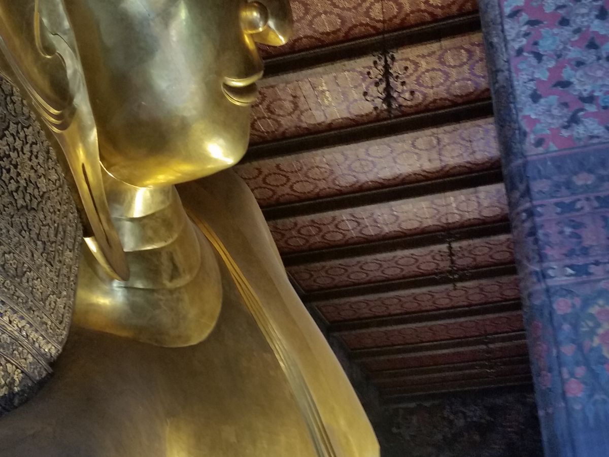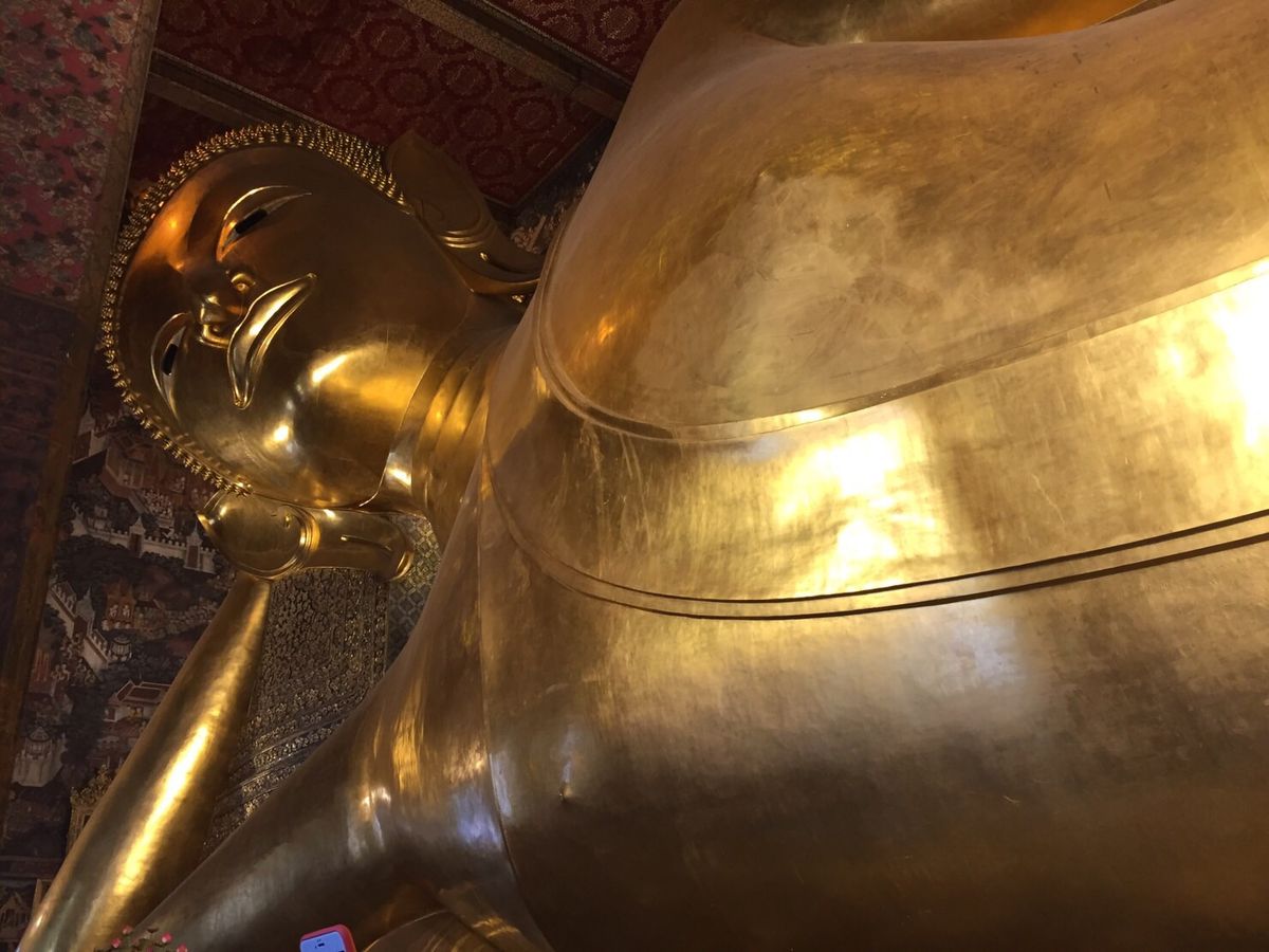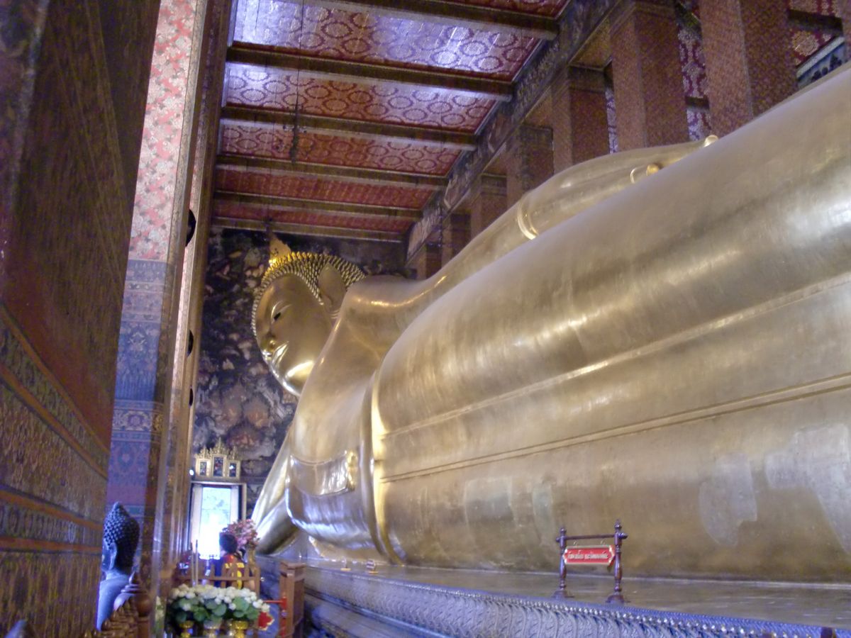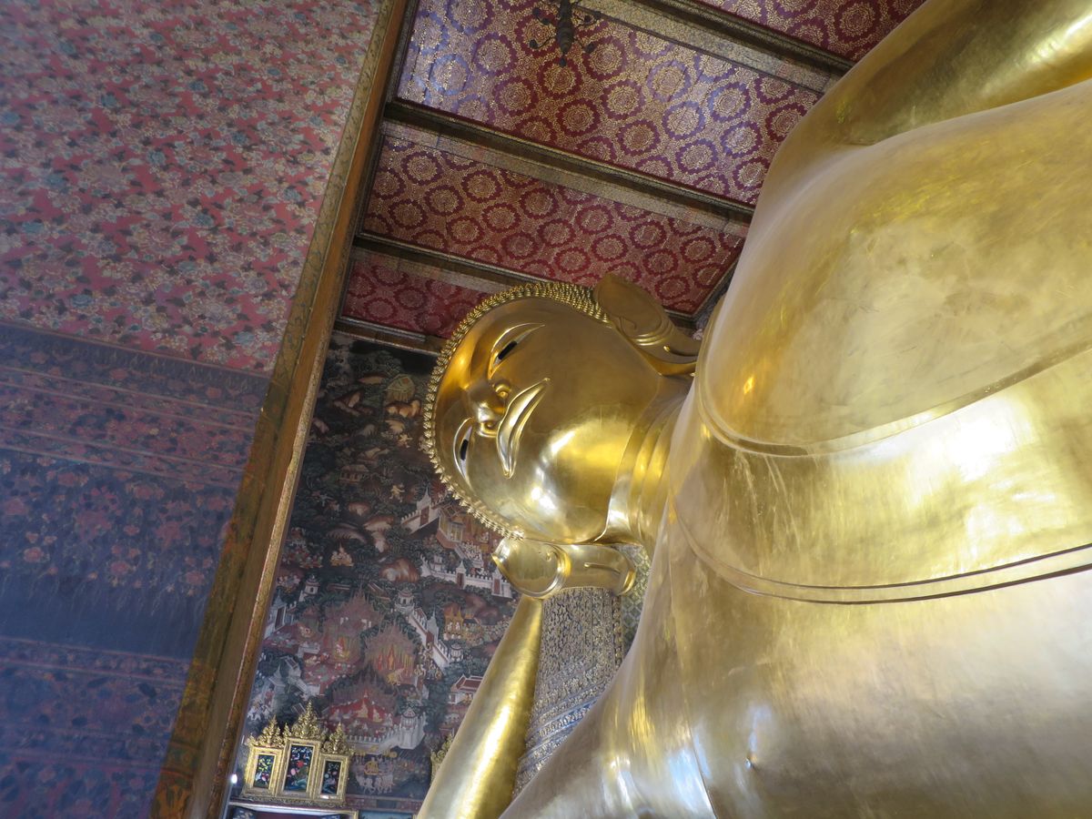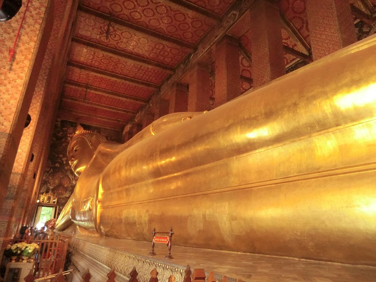 次に訪れたワットポーでは、黄金の涅槃像が予想していたよりも大きく、迫力がありました。また、写真で見ていたよりも涅槃像の顔が穏やかで、安らかな気持ちにさせてくれます。