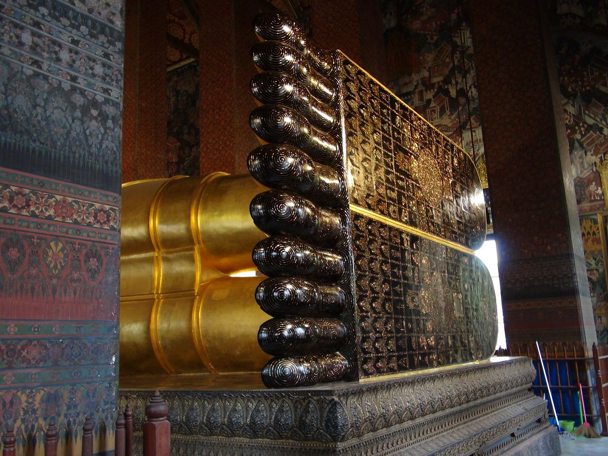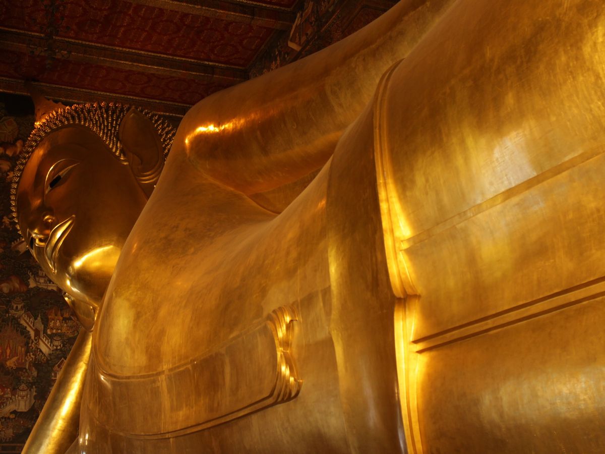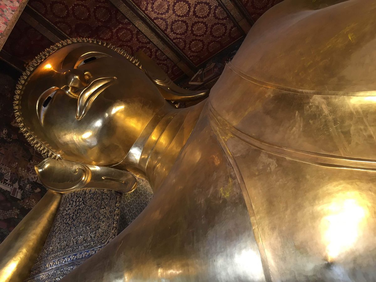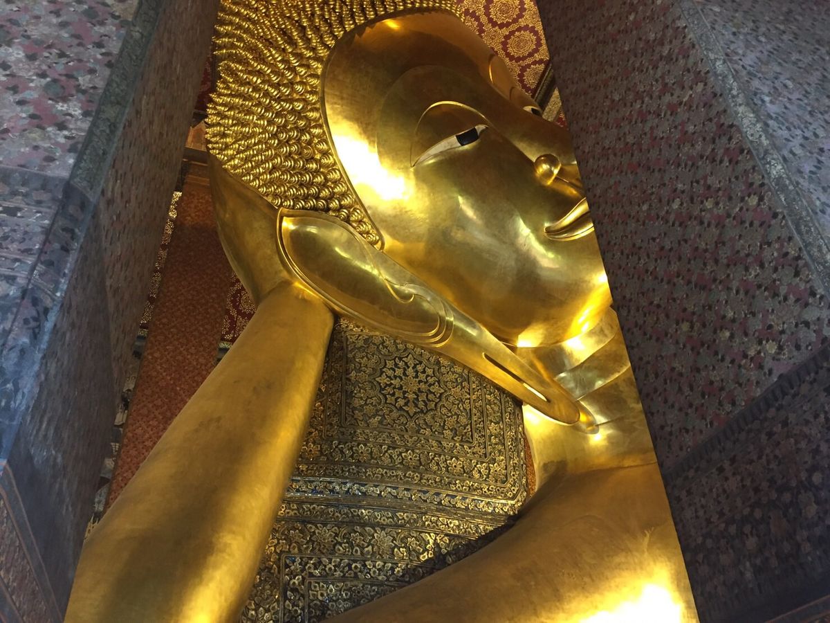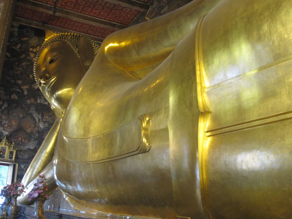 次に訪れたワットポーでは、黄金の涅槃像が予想していたよりも大きく、迫力がありました。また、写真で見ていたよりも涅槃像の顔が穏やかで、安らかな気持ちにさせてくれます。