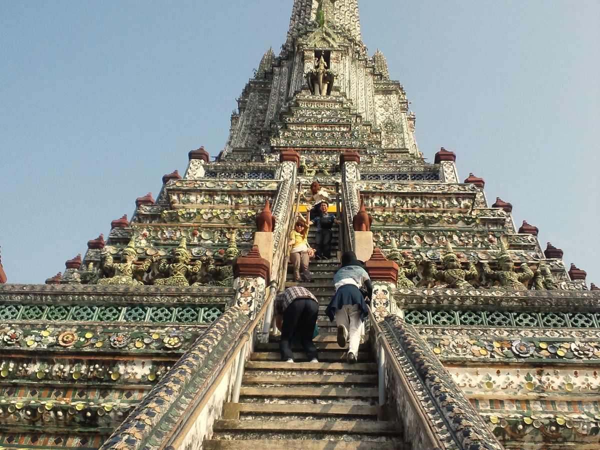 ワット・アルンはとても美しい寺院で、急な階段を上るところではへっぴり腰の友人たちを写真に収め、楽しめました。長いスカートでは危険です。