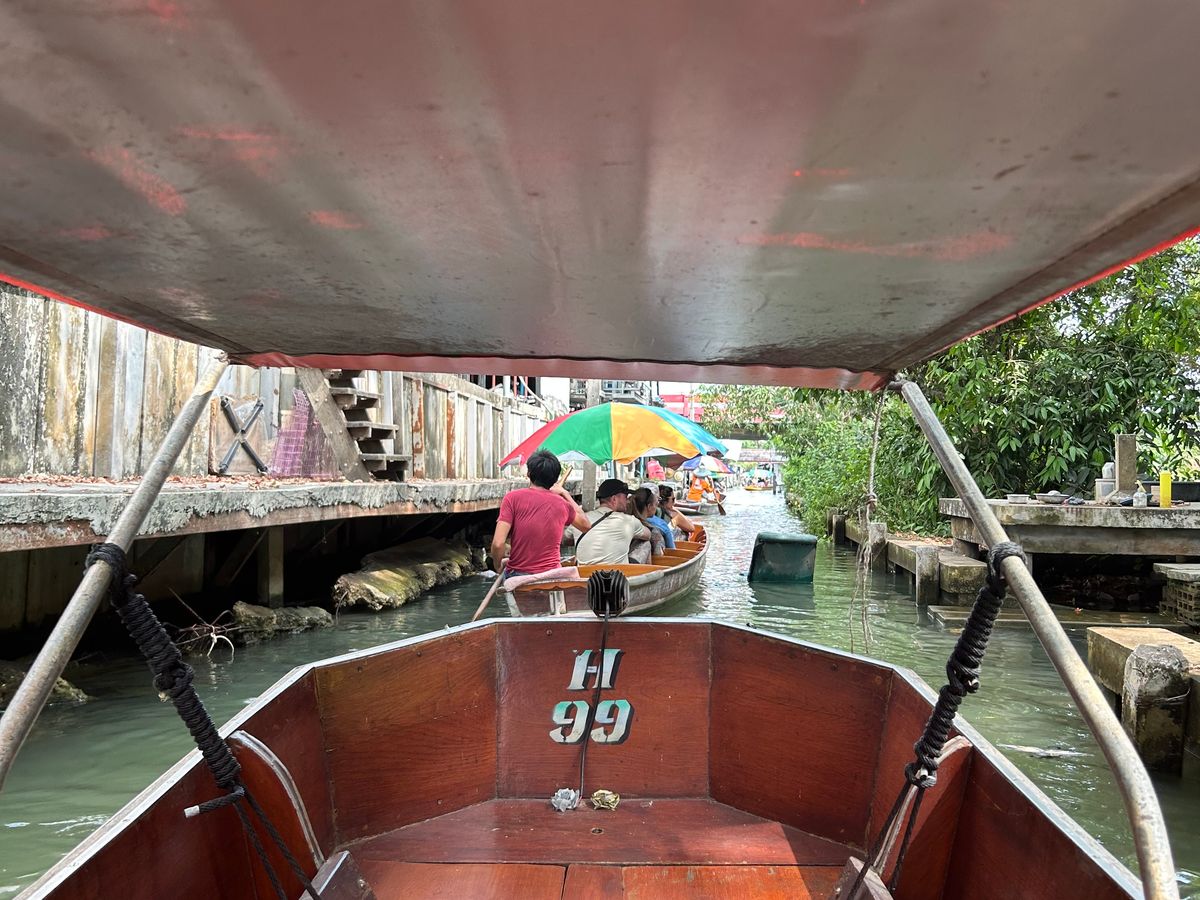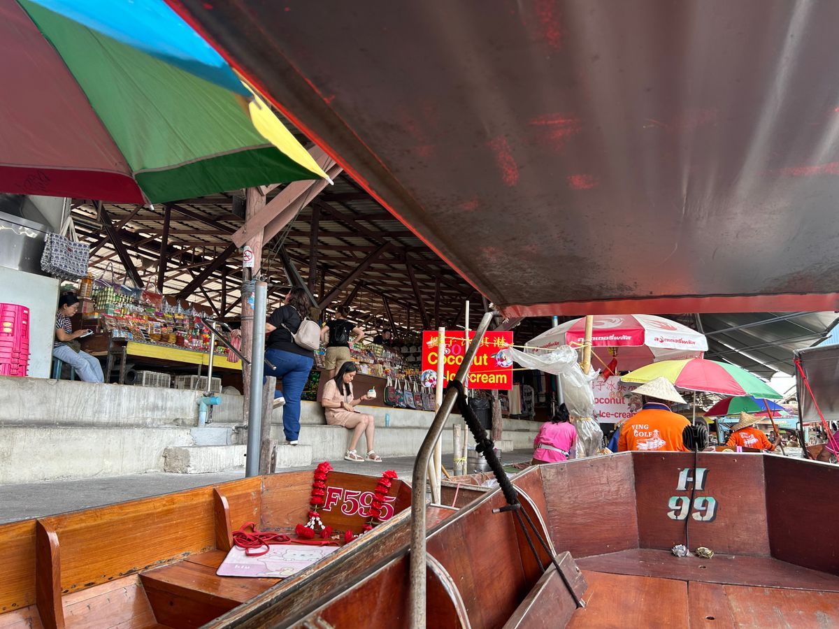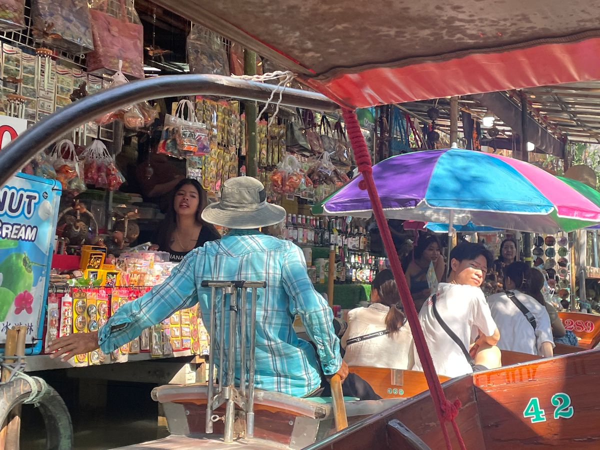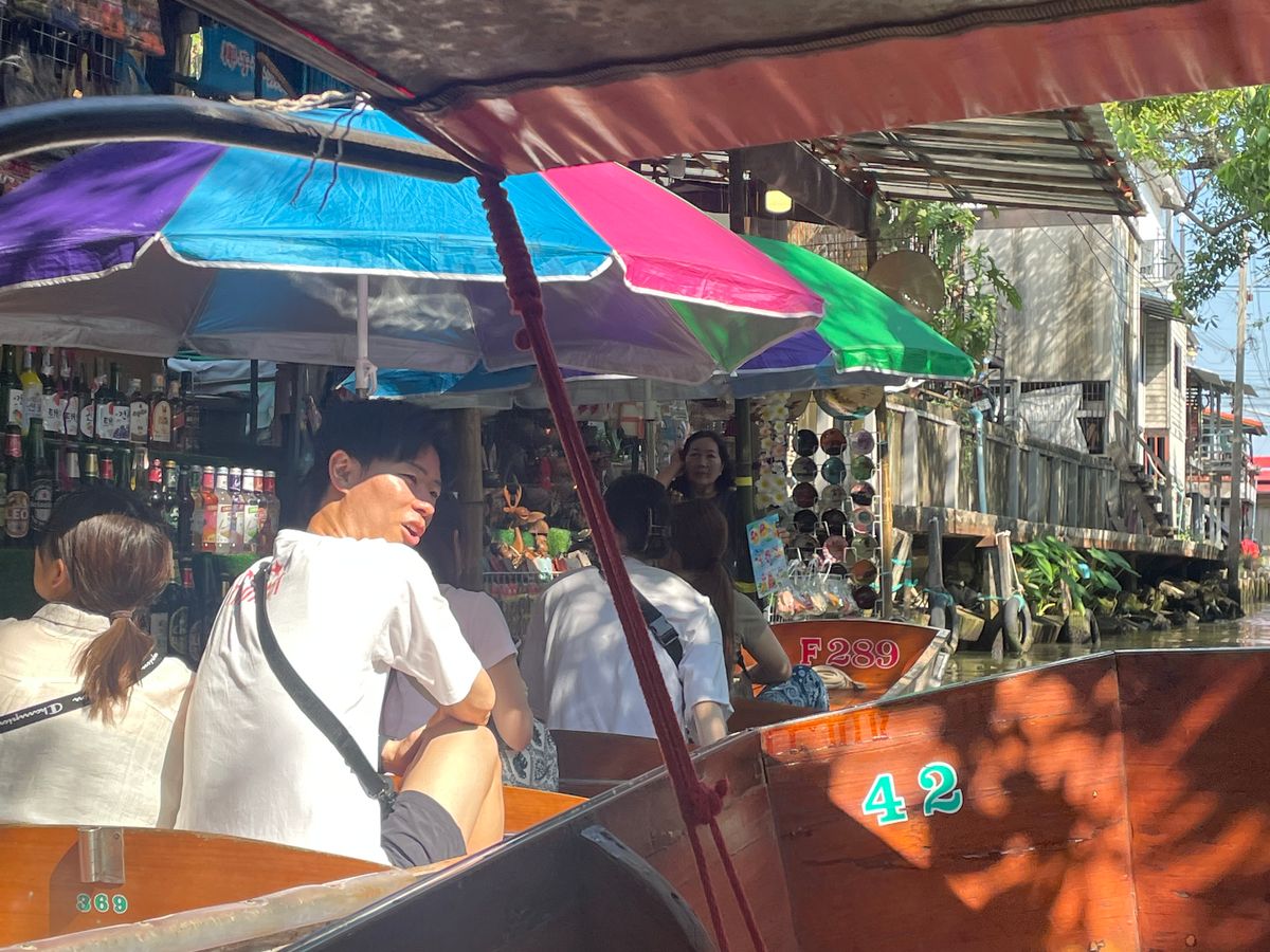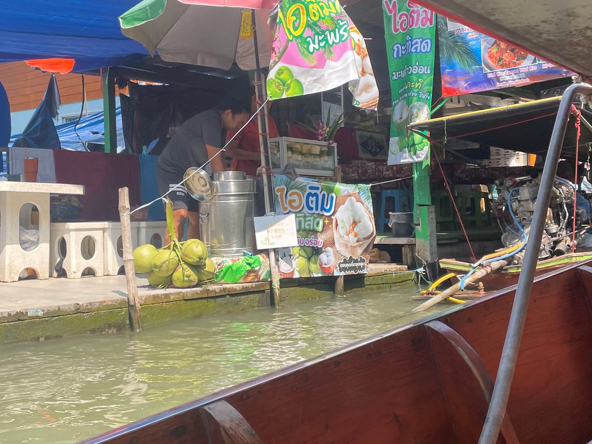 次に訪れたのはダムヌンサドゥアック水上マーケット。手漕ぎボートに乗り込み、運河沿いの店を巡りました。フルーツやお土産、タイ料理の屋台などが並び、どこを見ても賑やかで楽しい雰囲気。ココナッツアイスを食べながらのんびり過ごし、タイらしい風情を存分に味わいました。
