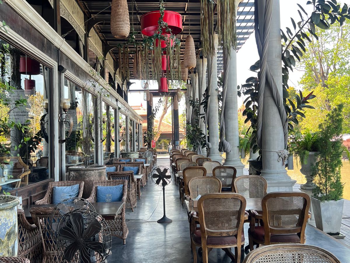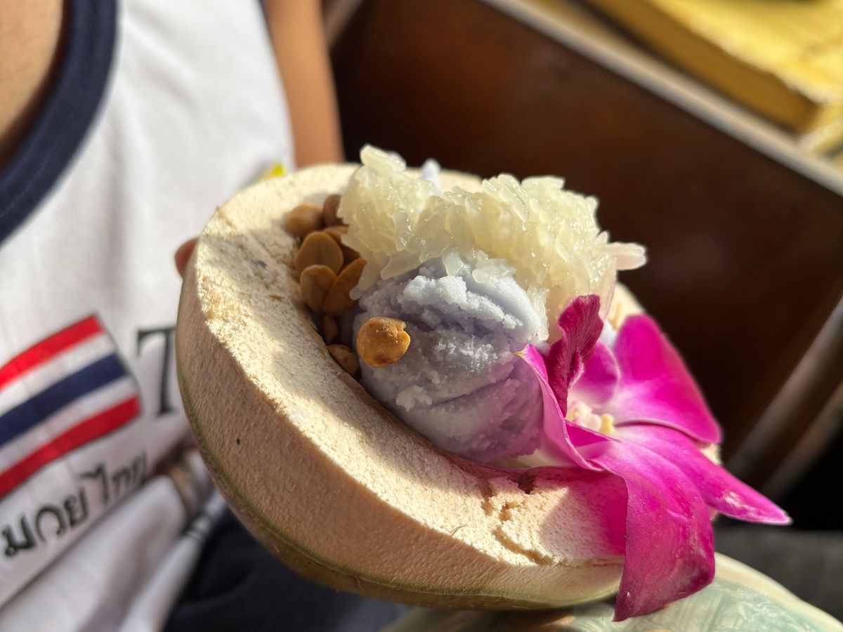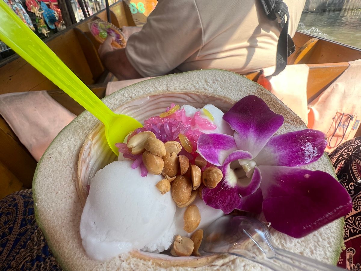 水上マーケットではココナッツアイスがおすすめです。カフェはお値段が高めですが逆見本詐欺でメニューより豪華なのが出てきます。