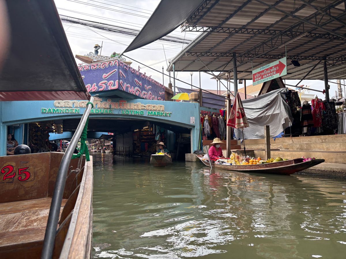 次に訪れた水上マーケットも、まさにバンコクらしい光景が広がる場所でした。ボートに乗りながら、川沿いに並ぶお店を眺めたり、実際に買い物をしたりと、活気ある雰囲気を楽しめました。ボート同士がすれ違いながら、フルーツや軽食、雑貨などを売る様子はとてもユニークで、観光地でありながらも地元の文化が感じられました。