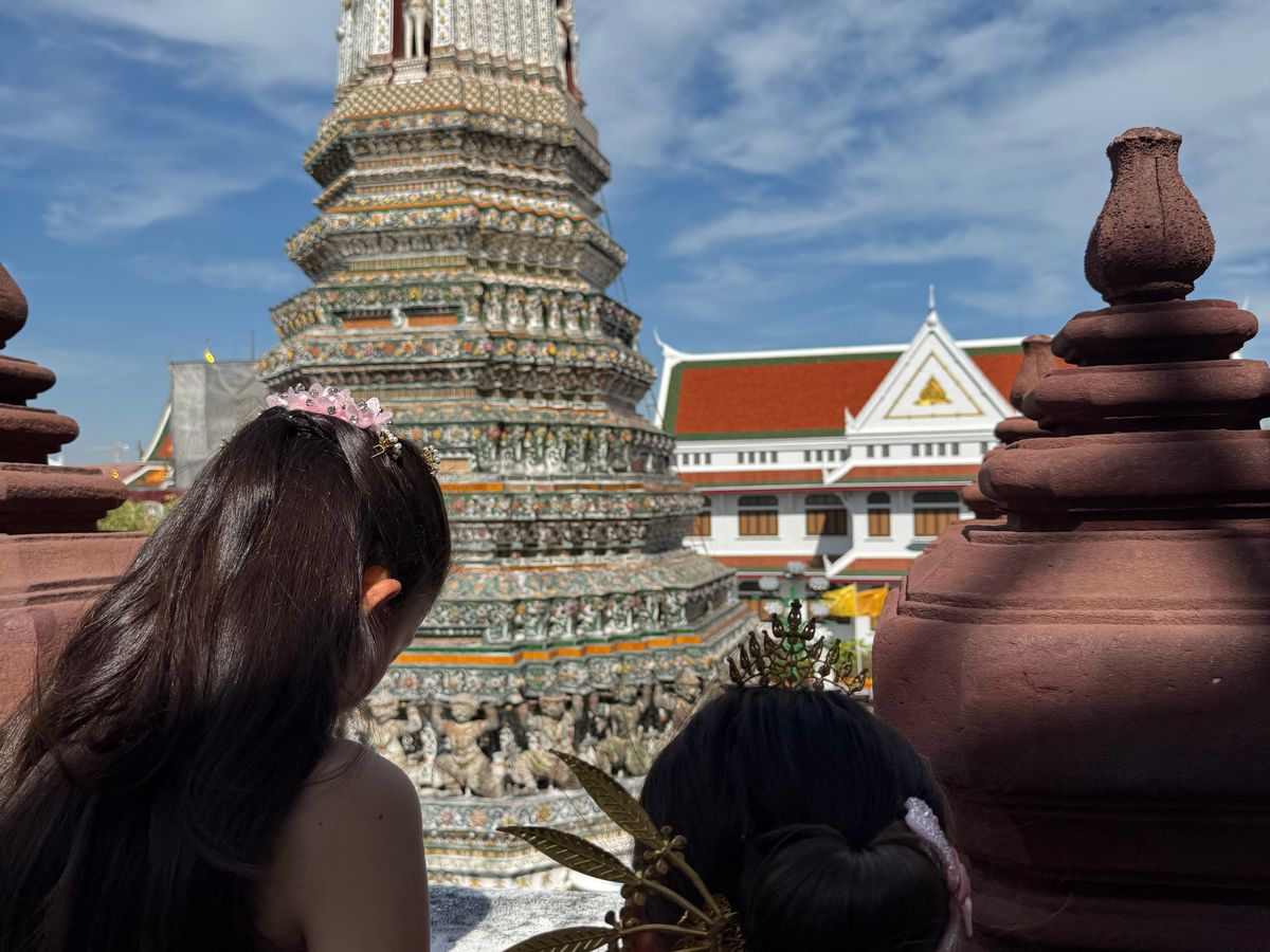 寺院に入ってから子供がタイ衣装着たいと言って一度出てからタイ衣装着て再入場しました。帰りはホテルに送迎でしたが、市場で降ろして欲しいという要望にも対応してくださり、色々こちらのペースに合わせてガイドして頂いたおかげで大満足でした。子供の質問に詳しく答えて下さり、ガイドさんと手を繋いで歩く姿はおばあちゃんと孫みたいな感じでした。