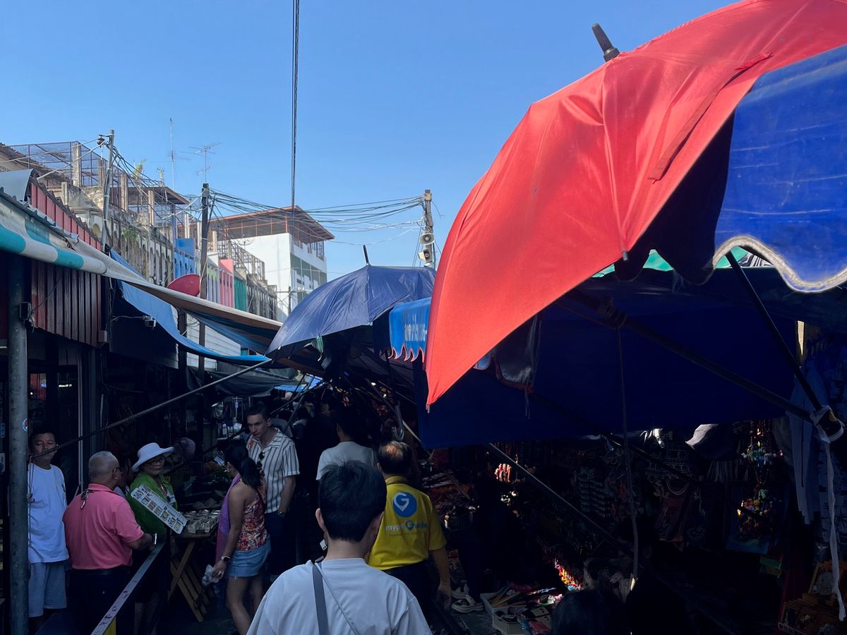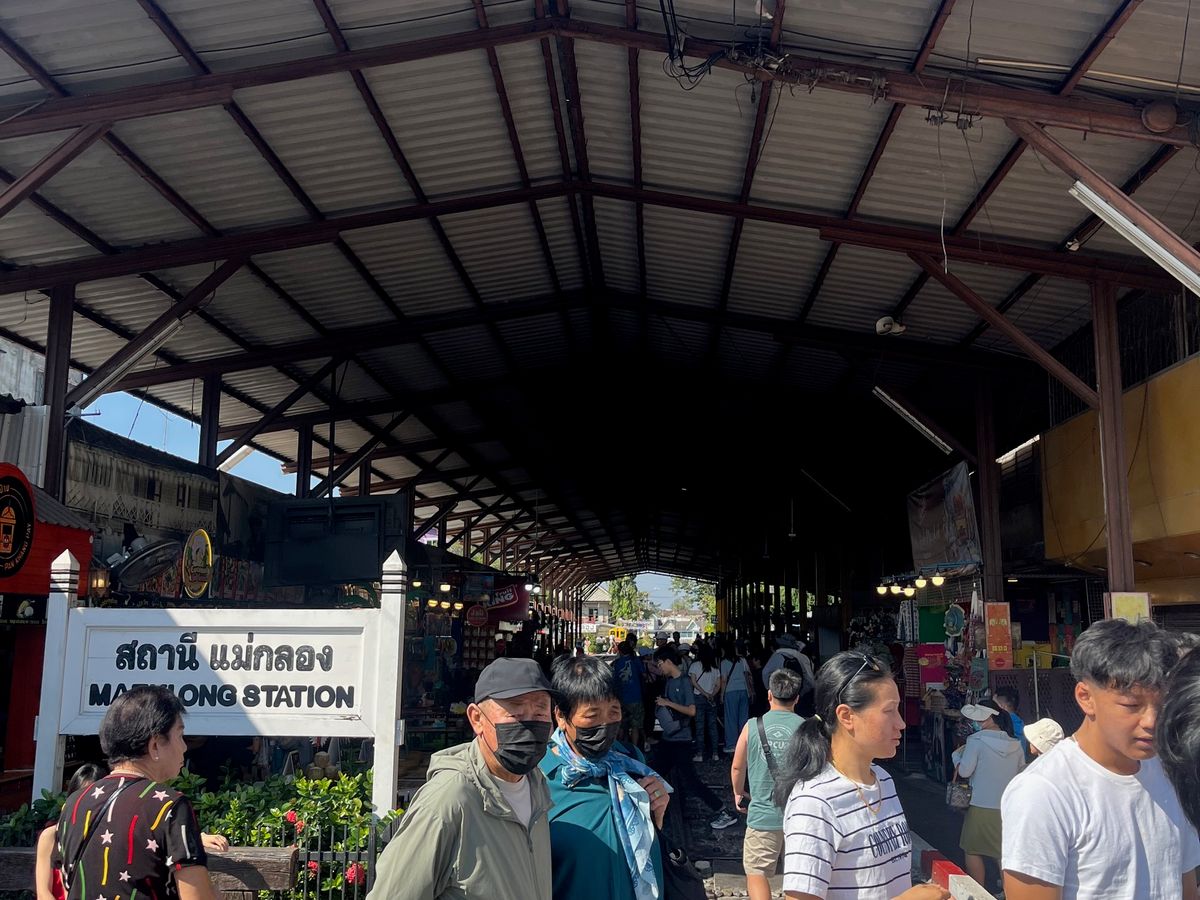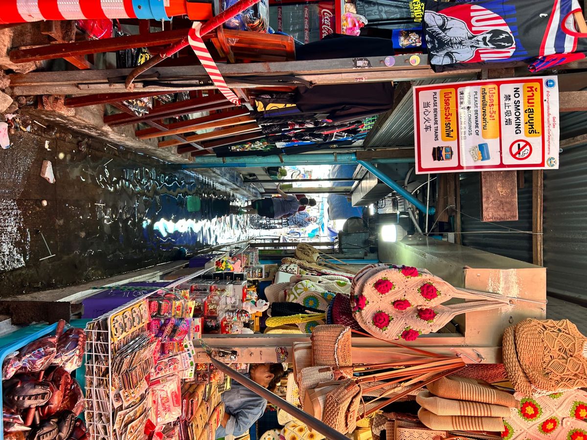 電車市場は、お土産から水産農産物の販売もあり、ローカルな市場の雰囲気も感じることができ、電車の到着時刻になると観光客が溢れるほど多くなり、驚きました!電車が駅に到着する際は、電車に乗っている観光客と線路周辺で見学している観光客がハイタッチをしている人達もいて、タイ?旅行ならではの雰囲気がありました。