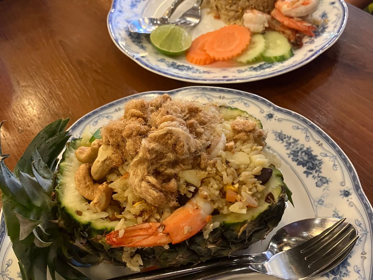 私と妹はパイナップルチャーハンを先に注文してからタイの民族衣装に無料で着せて貰いました。綺麗なアクセサリーも付けてくれて、ガイドさんがいっぱい写真を撮ってくださいました