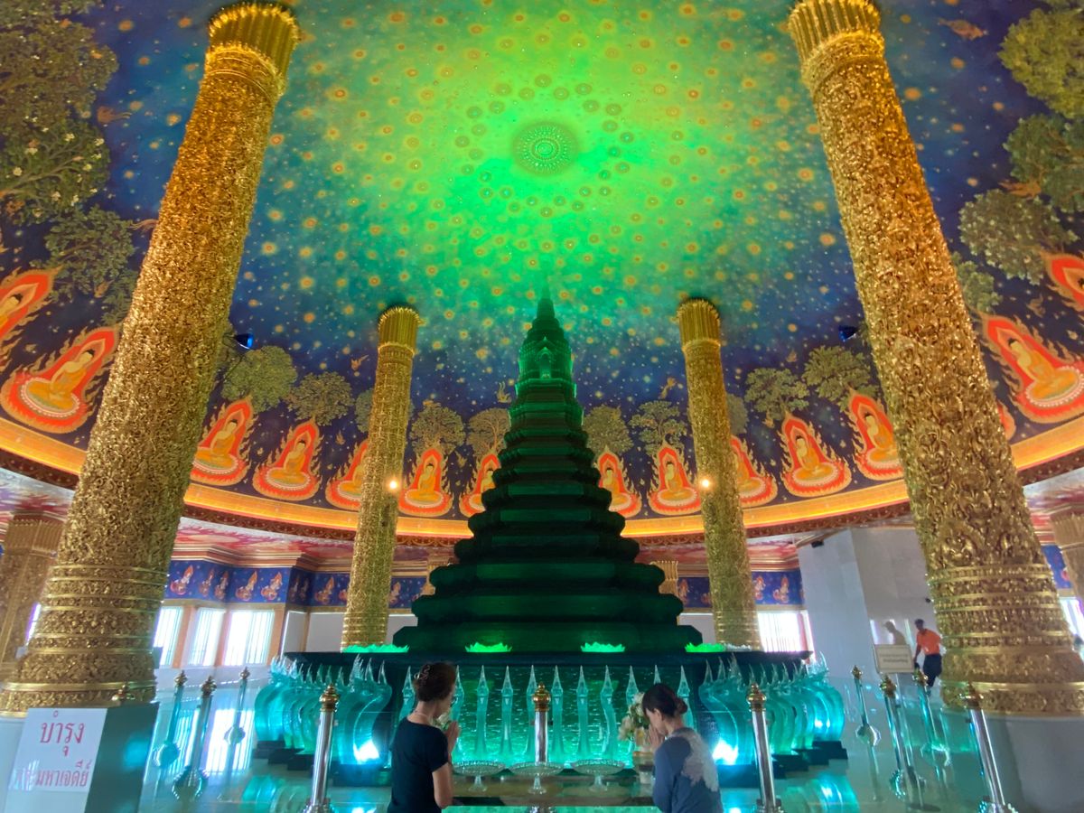 最初に訪れたのはワット・パークナム。残念なことに黄金の仏像は修復中で見られませんでしたが、白い大仏塔の5階にはSNSで話題のエメラルド色に輝く仏舎利奉安塔と仏伝図がり、それは言葉にはできないほど幻想的で、美しかったです。