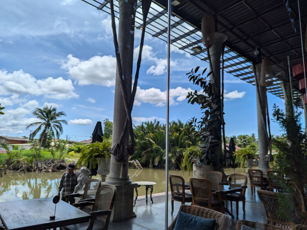 カフェは写真映えするほど素敵な空間でした。傍の川ではオオトカゲが泳いでいるのを発見、子供が喜んでいました。