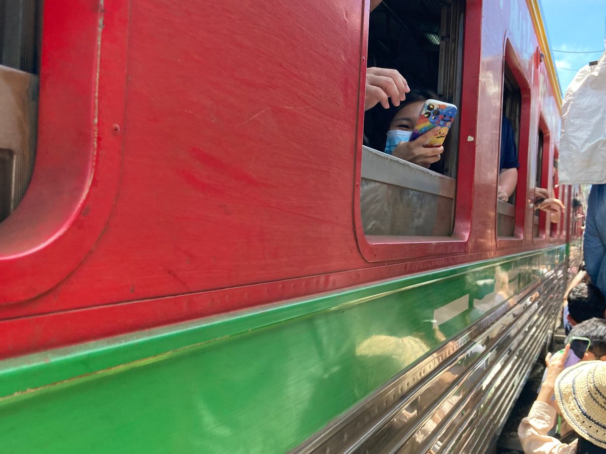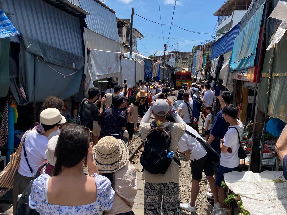 メークロンは、たくさんの観光客がいる中をスレスレの距離で通過する電車は、本当に迫力あります!ただ、待っている間がかなり暑くなるので、通り沿いのカフェなどで休みながら電車を待つのがおススメです。
