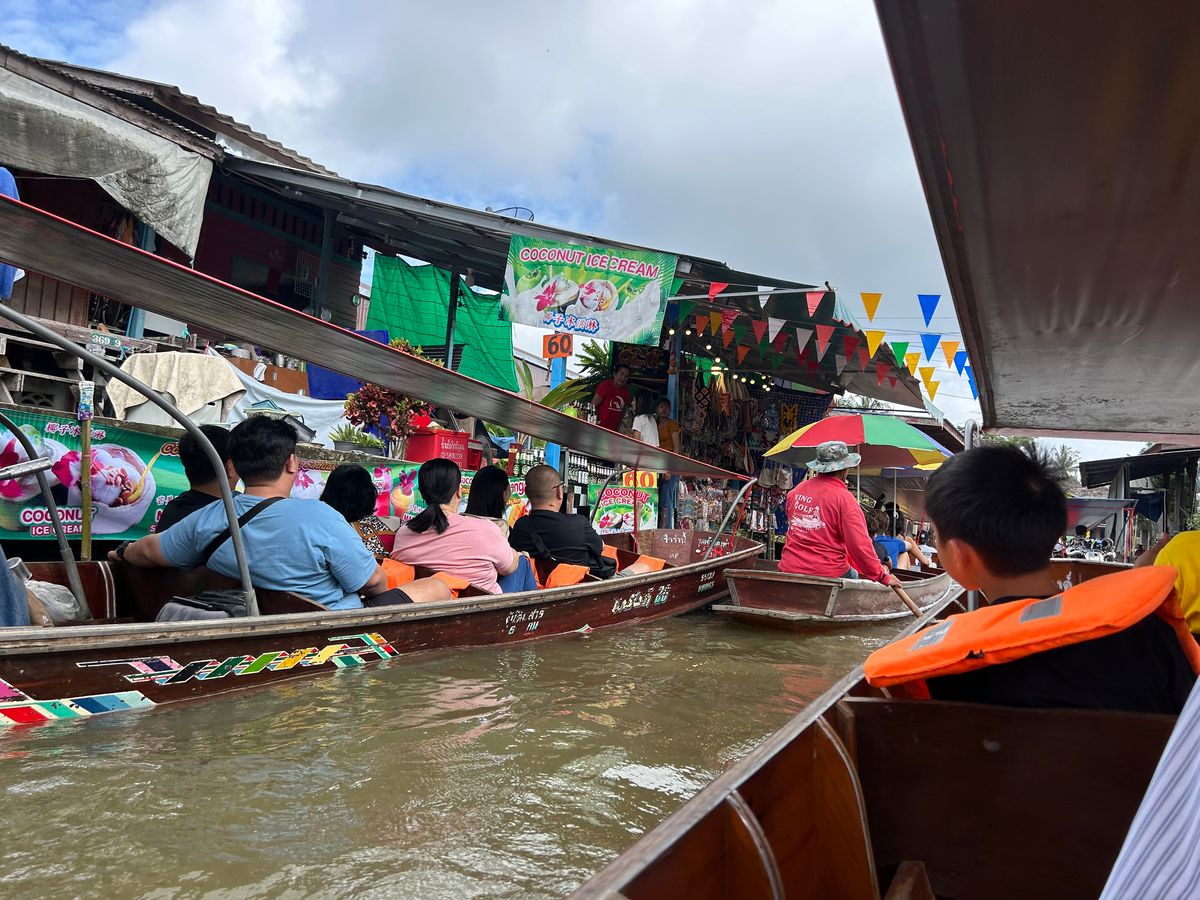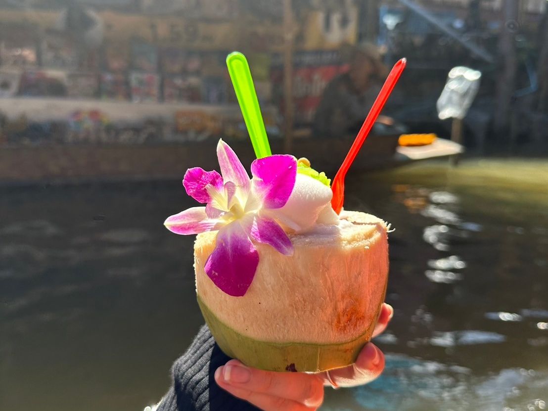 まず水上マーケットに向かいました。ローカルな暮らしぶりを覗きつつ、マーケットを一周し、船上からココナッツアイスやマンゴー、雑貨を買うことができます。私の船は日本語が話せるガイドさんがいたため、希望のお店に寄ってもらうこともできました。