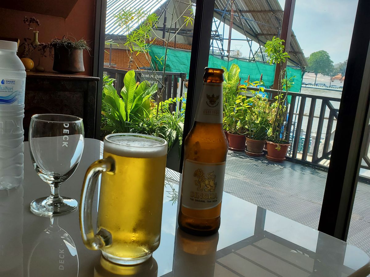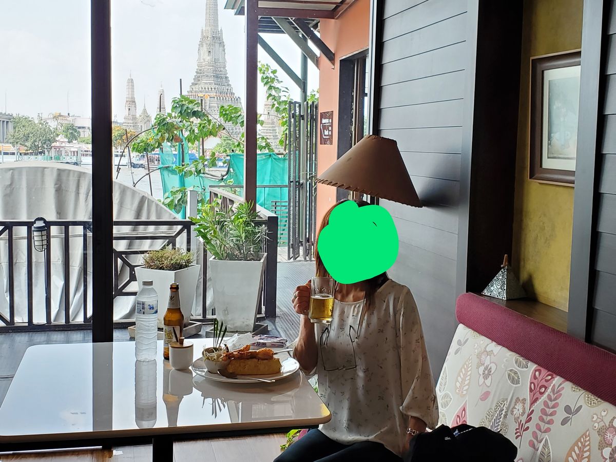 ランチは2階に案内され、席は室内で窓から川の向かいの寺院は周りの汚い建物の隙間にほんの少ししか見えませんでした。せめて写真だけでも綺麗に撮りたいと思い、上の階に行こうとしたら店員さんに止められました。お料理は本場のタイのお味ではなく、多国籍な感じで、パッタイはケチャップ味、ガパオライスはカレー味、普通に美味しかったです。足休めにはなりました。