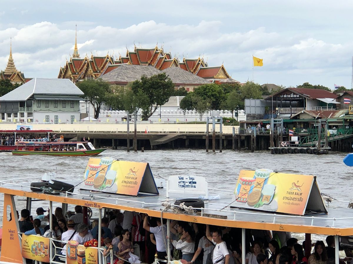 ワットアルンには船で行きます。この船も日差しが照り付ける中、並んで待ちます。船も混雑します。対岸から見たワットアルンは本当に美しかったです。