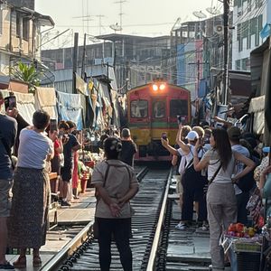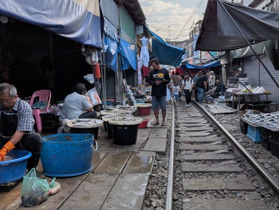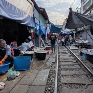 バンコクから少し足を伸ばして、不思議な市場へ。 線路沿いには新鮮なフルーツや魚が並び、地元の人たちの活気で溢れています。