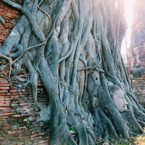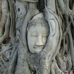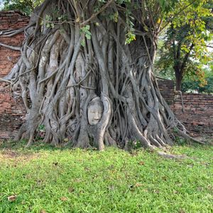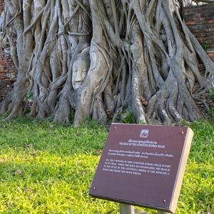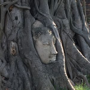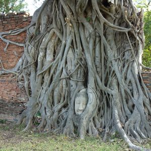 次も遺跡へ、一番の目玉、木の中の仏頭です。ここは観光客が多いので順番に撮影しましょう。仏頭より低い位置での撮影が基本ですが、スノコの様な台があるので、座って撮影出来ます。ガイドさんに撮ってもらいました。