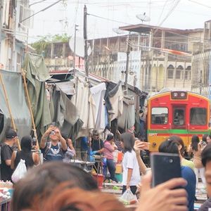メークロン線路市場は、まず列車が来る前に、市場を見て回り、