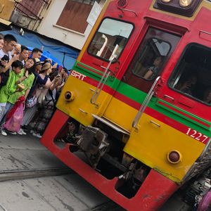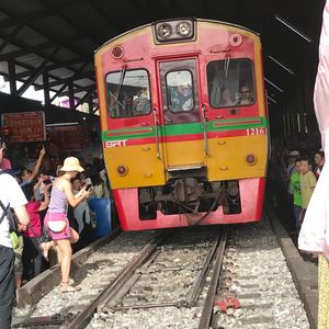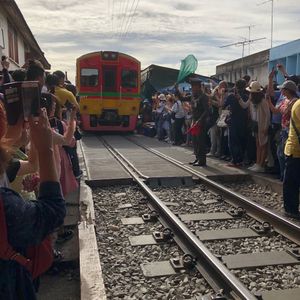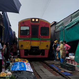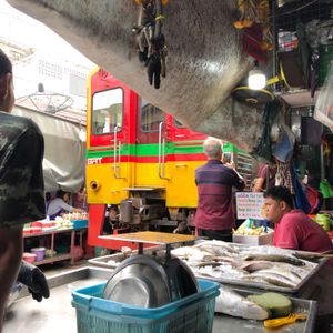 メークロン路線市場では、最前列で電車の通過が見れて興奮!!