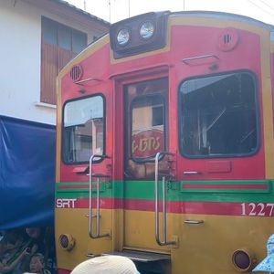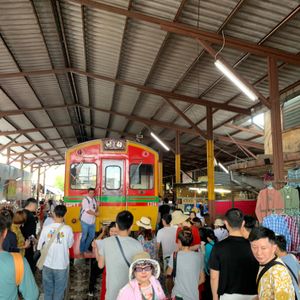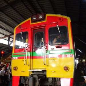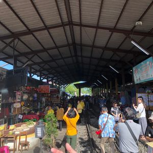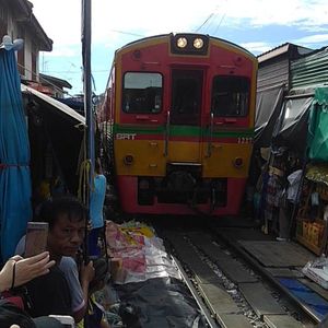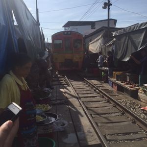 メークロン市場は50分くらい待ち時間がありましたが、線路脇の店を見回り、市場も一周しました。カルチャーショックを受けます。ぜひ、時間を有効的につかって現地の生活を目の当たりにしてください。小腹がすいたので駅にある店でパッタイを食べました。50バーツで美味しかったです。まだ少し時間があったので、ガイドさんに話しかけて色々教えてもらいました。電車はですね、よい場所でしたので迫力がすごかったです。圧巻です。