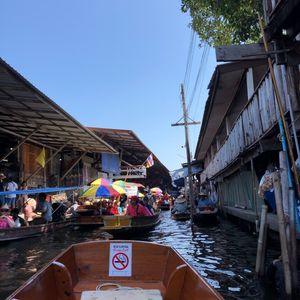 最初のココナッツのところは思ったより小規模で残念な感じでした(笑)でもせっかくなので試食でおいしかったココナッツ砂糖を2袋50バーツで買いました。トイレは汚く5バーツの有料となっていますが、バンコクから1時間半かけてきたため皆利用してました。そこから水上マーケットへ向かい、着いたらすぐ写真スポットでガイドさんから写真を撮ってもらいます。その後すぐにボート乗りのところで200バーツを払い乗り込みます。有無を言わさず同じツアー客と一緒の船でした(4人乗り)。水上マーケットは完全に観光用のマーケットとなっており割高なので、値段交渉して希望額にしてくれないなら買わない姿勢で良いと思います。ボートでの周遊時間が30分程度かかり(2組乗ってたので値段交渉やらで各々時間がかかる)、終わってからココナッツアイスを買ったり写真を撮ったりバタバタしちゃったので、別にボートには乗らなくても良かったかも。それかココナッツファームの立ち寄りを無しにして、水上マーケットの時間配分を長くとってほしい。