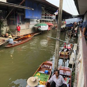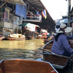 オプションの手漕ぎボートは大混雑で、お店を眺める程度でしたが、水上ボートは猛スピードでスリル満点のアトラクションでした。GWで沢山の観光バス、観光客がいましたが、ガイドさんがタイミングよく案内してくださったので、待ち時間などもあまりなく、快適に観光できました。私たちを含んで3組のツアーでしたが、帰りはもうひと組の参加者の方とサイアムスクエアで降ろして頂けたので、ホテルに戻るよりも効率的に活動できました。