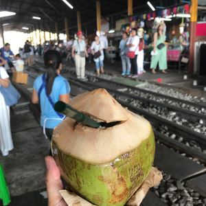 何と電車では最後部の席を指定されて?なぜ?先頭車両は先を競う様に乗り込んでいる中、ガイドさんの言う通り最後尾の人気の無い車両に乗車しました。車窓の景色は塩田だけメークローンに近ずくとガイドさんが小声で車掌と何か打ち合わせ?何と最後方の車掌室両脇2部屋を解放して、我々に『案内計器には絶対触れない様に』と注意をされ、車掌室は私達だけ五人の特別観覧席になりました。わずかなチップをわたし最高の待遇を経験できました。何時もできるわけでわないので内緒とガイドさんは満足気????ちなみにチップは一人20バーツ(80円)の限定4人のみの指定席料金なのかも?車掌室からの景色はまるでテレビの画像を見て色ようで感激です。タイに来たら是非参加してみて下さい。最高の体験を経験出来るはずです!今回手漕ぎボート船には乗りませんでしたが、市場のココナッツアイスとバナナフライは朝早いツアーなので、オススメの軽食になると思います。絶対食べてね!