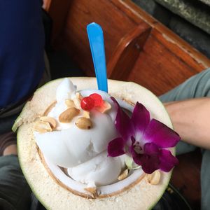 水上マーケットでは、小舟に乗りながら、ラーメンやココナッツアイスを食べました。また、ガイドさんからバナナ揚げの差し入れもあり、とても楽しく過ごすことができました。
