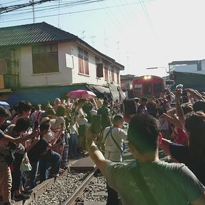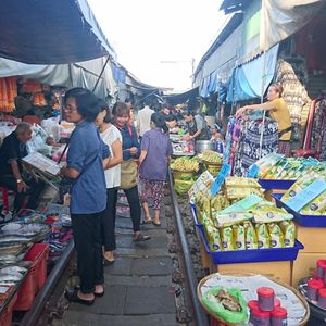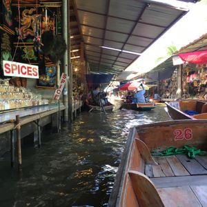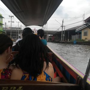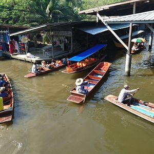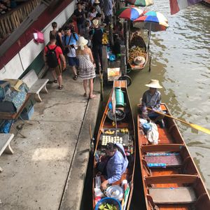各自の小屋で物を売っていて、写真も撮ってもらいました。水上マーケットはすごい人でした。小型の手漕ぎボートが今にもひっくり返りそうなスリルでした。メークローン電車は昔の汽車のようで傘たたみが電車の中から見れて楽しかったです。ガイドさんも優しくて色々細かく説明してくださいました。