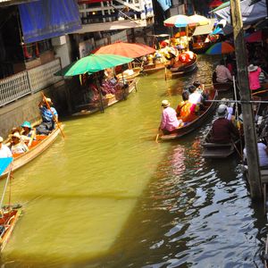 タイ・バンコクの水上マーケットでは、船で商品を売買する昔ながらの市場を見学できます。果物や雑貨を積んだ小舟が運河を行き交う活気ある様子は、タイらしい雰囲気がいっぱい。バンコクから行ける市場は主に3つあり、車で約2時間以内の場所にあります。バスや電車で行けますが、本数が少ないためツアー参加をおすすめします。 ■ダムヌンサドゥアック:毎朝開催の歴史ある市場。規模は一番大きく、早朝から小舟が行き交い、午前中が最も賑わいます。手漕ぎボートに乗って買い物を楽しむことも可能。船着き場からスリル満点のエンジンボートに乗って行きましょう。 ■アンパワー:週末限定で開催され地元民に人気。木に集まった無数の蛍を見られる午後ツアーが有名。 ■アユタヤ:2010年に誕生した新しい市場。連日のように地元タイ人で賑わっています。 現地ツアーを利用すれば、行き方を調べることも不要、自力で行くよりも便利です。格安ツアーや象乗りとセットのツアー、歴史などが学べる日本語ガイド付きツアー、一人旅に嬉しい割増料金なしや到着日に参加可能な空港お迎え付きツアーなどバラエティ豊かな商品をご用意してお待ちしています。