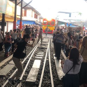 線路市場メークロンには8時前についたのですが、着いたときはそれほど混雑していなっかたのに、すぐに混雑してきました。列車が近づく時間になると場所取りがすごく踏切のとこからではほとんど見れません。いい場所を確保すにはお店の隙間がいいと思うのですが、入れるかはわかりません。